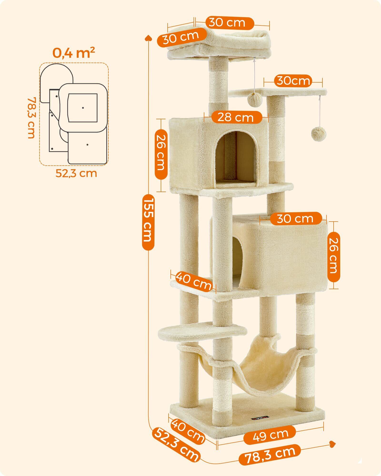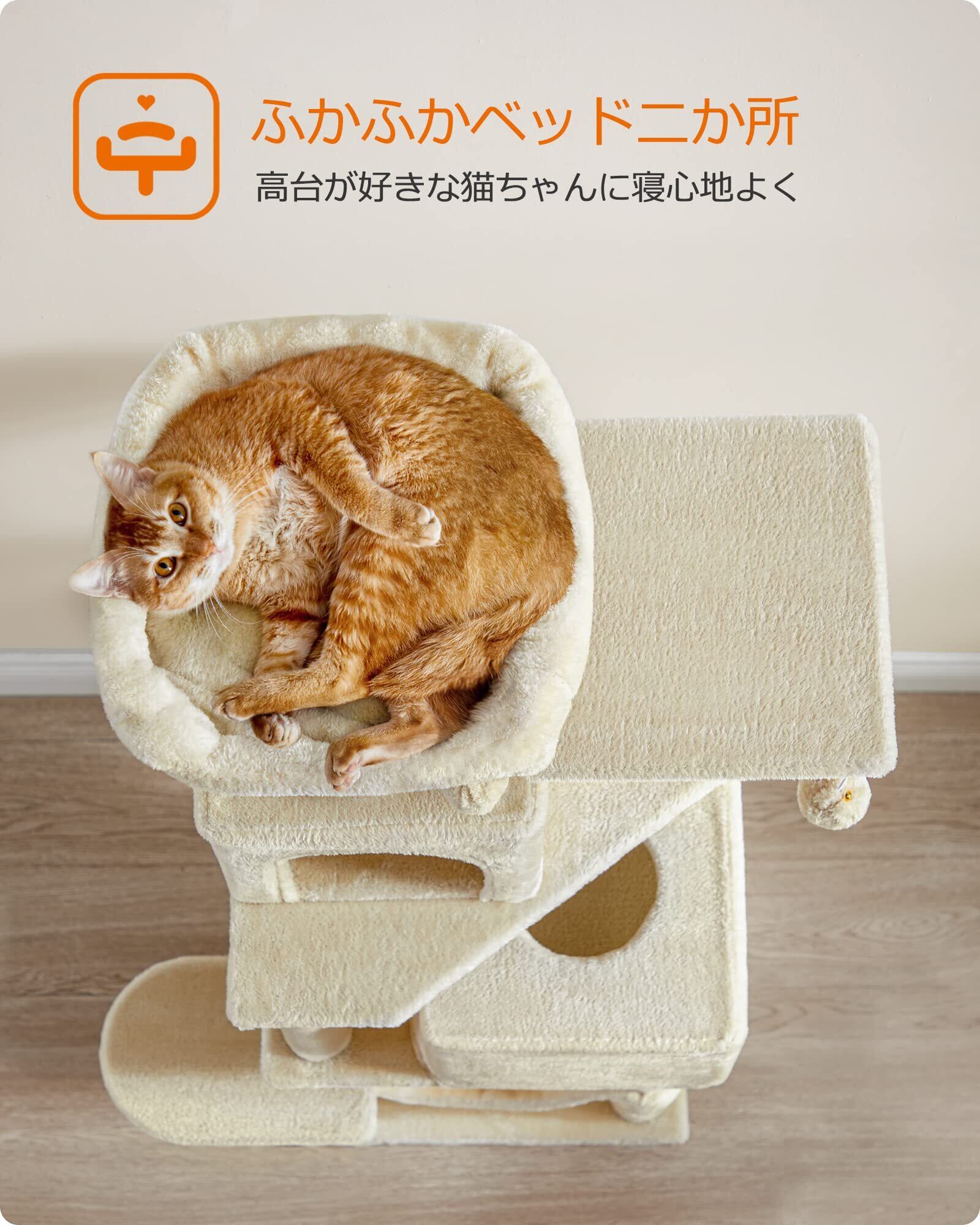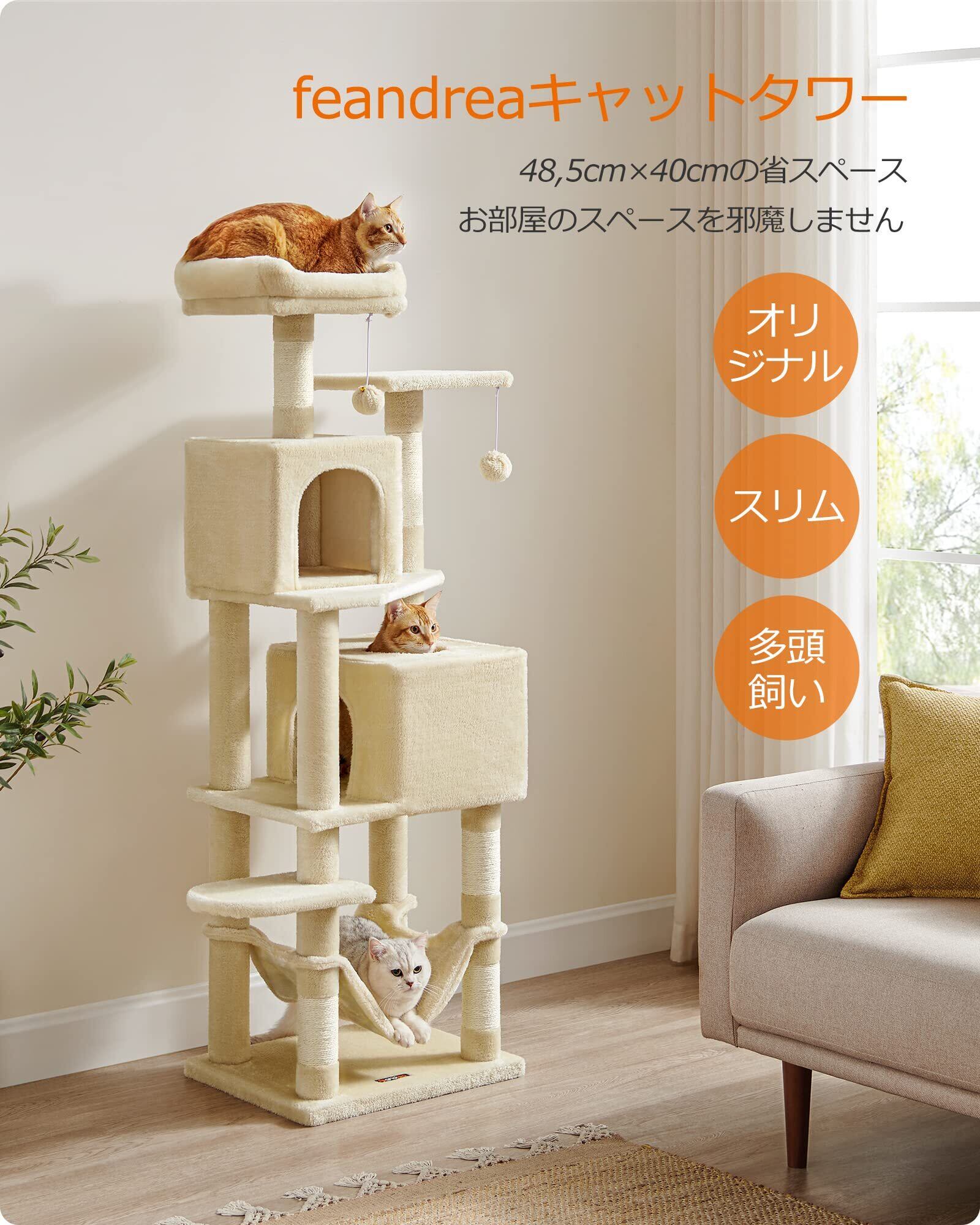 FEANDREA キャットタワー 猫タワー スリム 大型猫 多頭飼い 据え置き 省スペース ハンモック付き 爪とぎ 運動不足解消 高さ155CMベージュ PCT192M01
