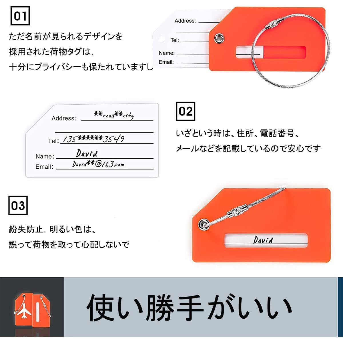 【個人情報保護】ただ名前が見られるデザインを採用された荷物タグは,十分にプライバシーも保たれていますし。いざという時は、住所、電話番号、メールなどを記載しているので安心です。