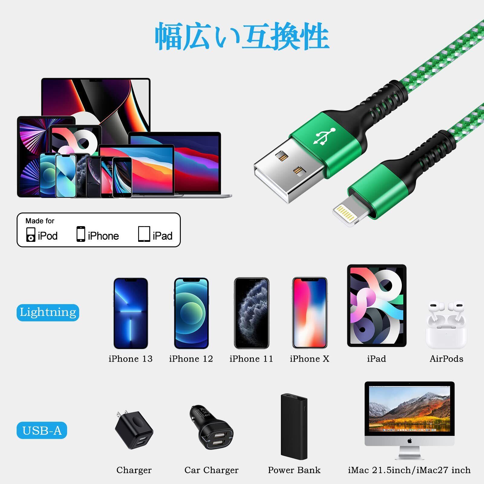 【幅広い互換性】本iphone 充電コードはほとんどのライトニングのポートを持つデバイスに適用されます。iPhone 13,13Pro,13Pro Max,12, XS,iPhone XS MAX, iPhone XR,iPhone X, iPhone 8, 8 Plus, iPhone 7, 7 Plus, iPhone 5 ,5C ,5S, iPhone 6,iPhone 6s, 6 Plus, iPhone SE, iPad Air, Miniなどに完全対応します。最新のios13,14,15との互換性があります。