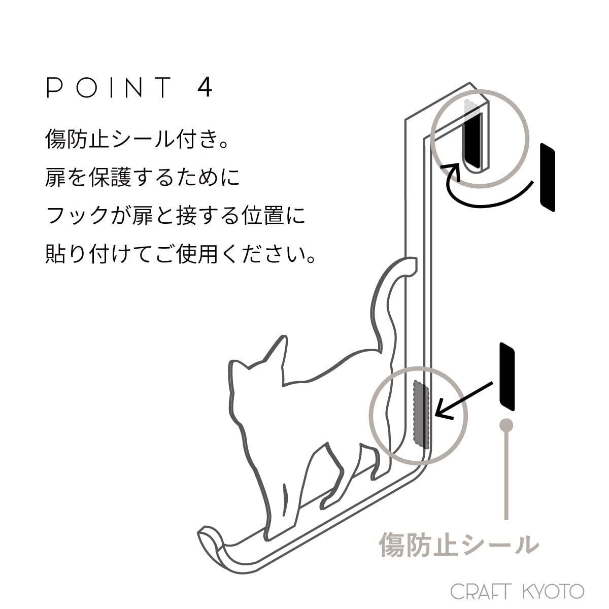 傷防止シール付き。扉を保護するためにフックが扉と接する位置に貼り付けてご使用ください。