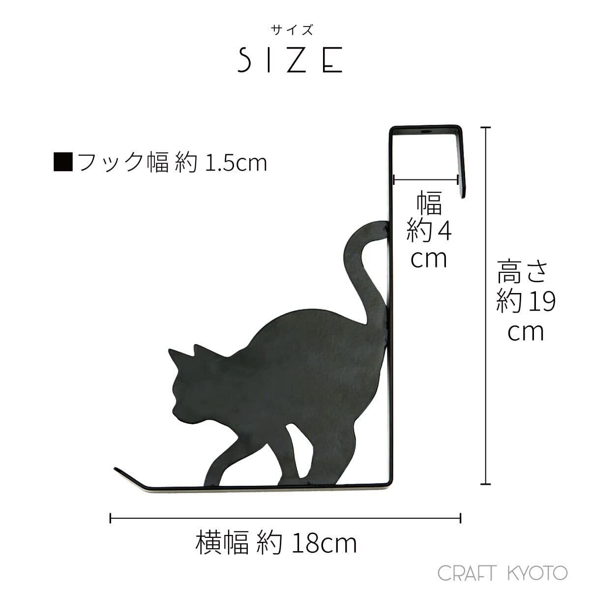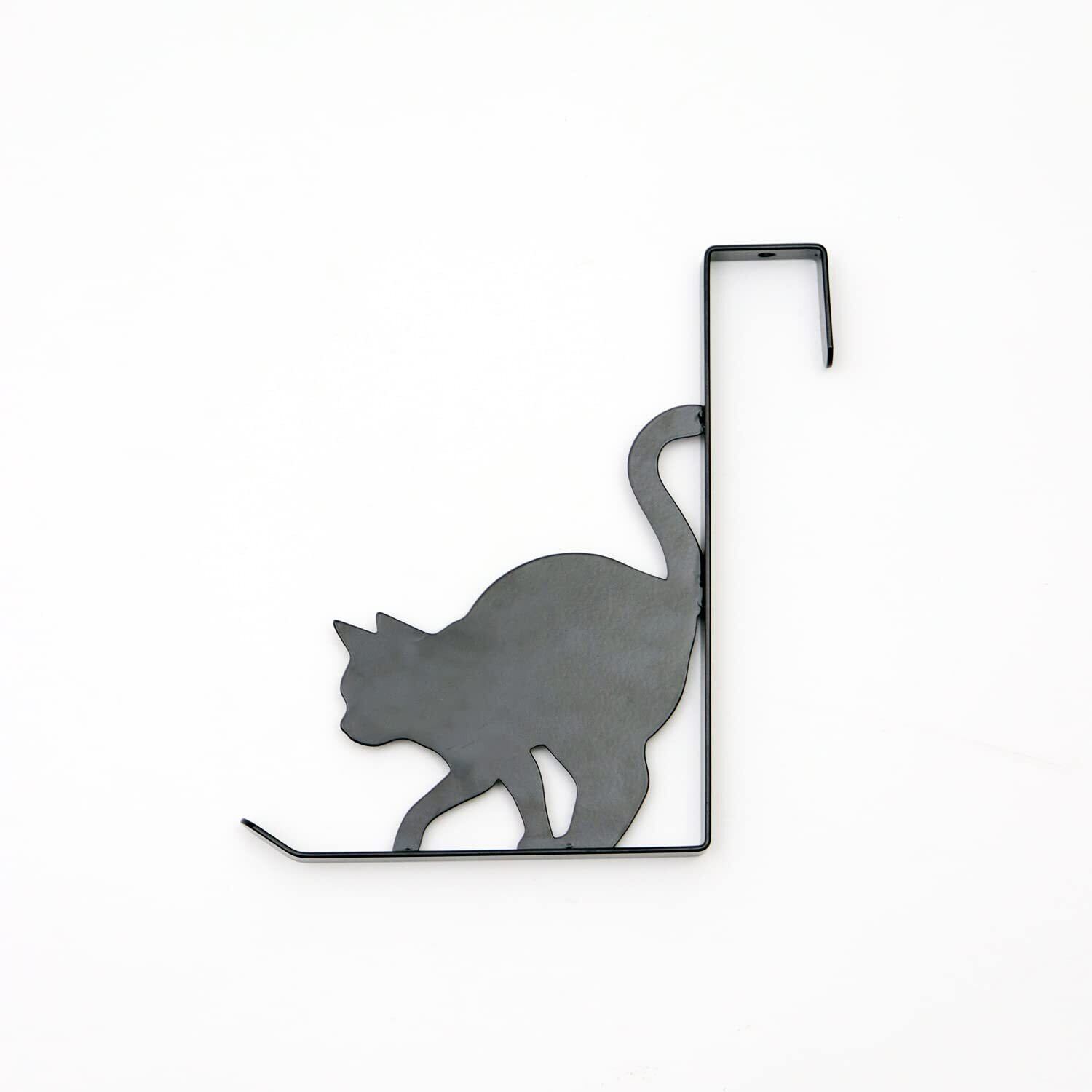 猫シルエットのドアフック。猫の足の隙間にハンガーを掛けることができて、フックの先端には帽子やバッグを掛けることができます。いつも使う鞄や上着・帽子をお部屋のドアに簡単収納。