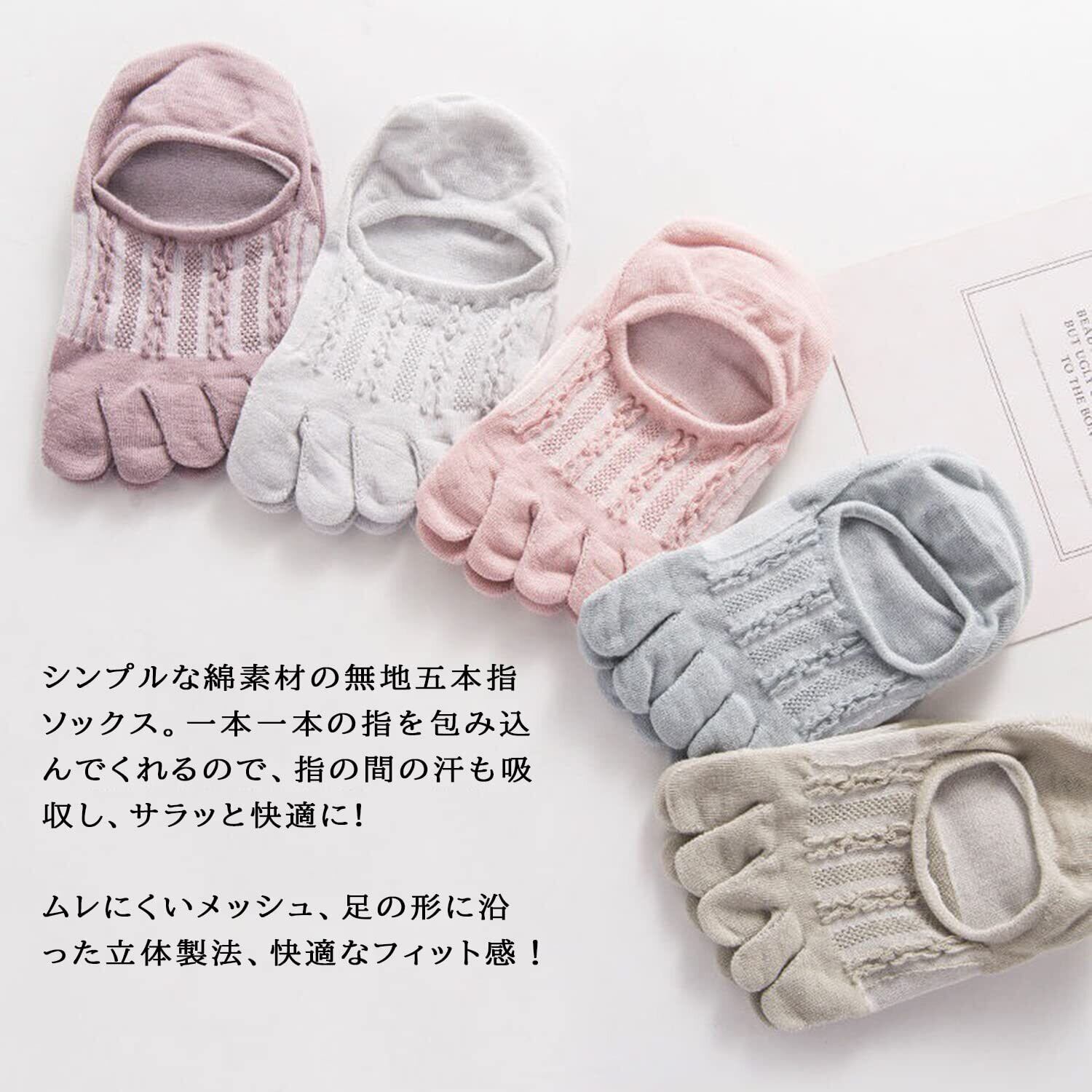 ·5本指レディースソックス、指先が一本ずつ分けているため、汗をより素早く吸って放出されるので蒸れずにおいにくい。これから暑くなる季節でも爽やかでサラサラな履き心地に続けられるメッシュ靴下 女性。