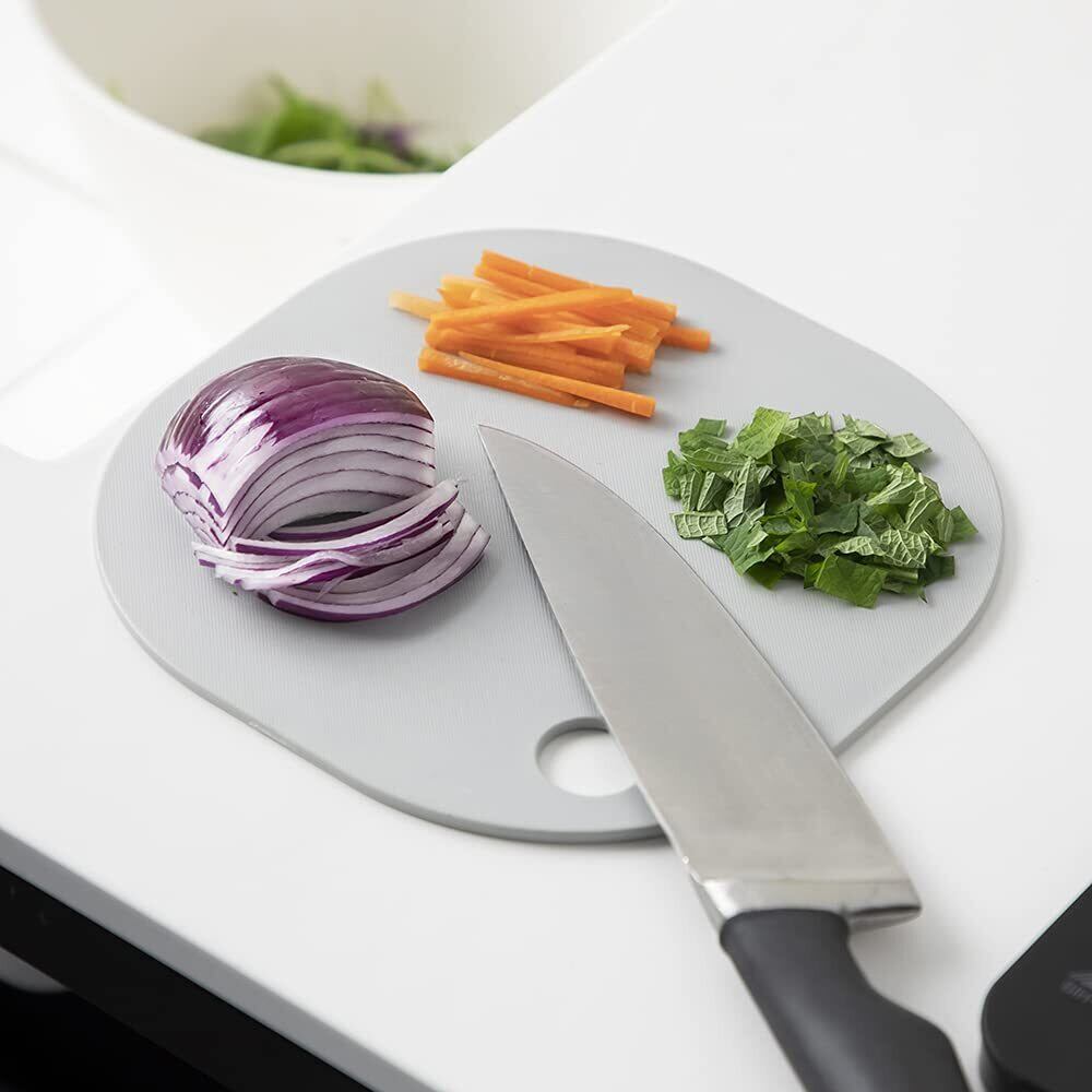くるくる回しながら違う具材をカットできる丸いまな板と、プライパンやお鍋に移し易い角がある四角いまな板の良いとこ取りの形状。