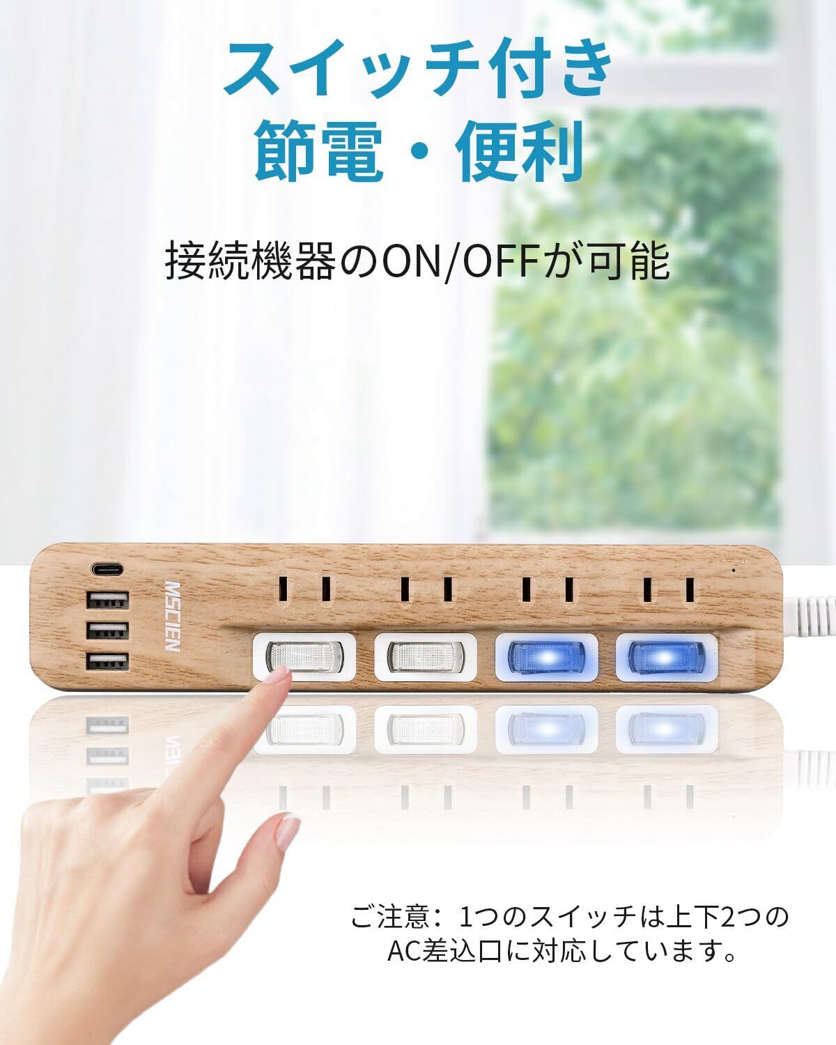 【節電】スイッチは接続機器のオン/オフができ、節電することができます。スイッチのLEDランプが青いで、通電がわかりやすくて便利です。(ご注意:1つのスイッチは上下2つのAC差込口に対応しています。個別スイッチではないです。)
