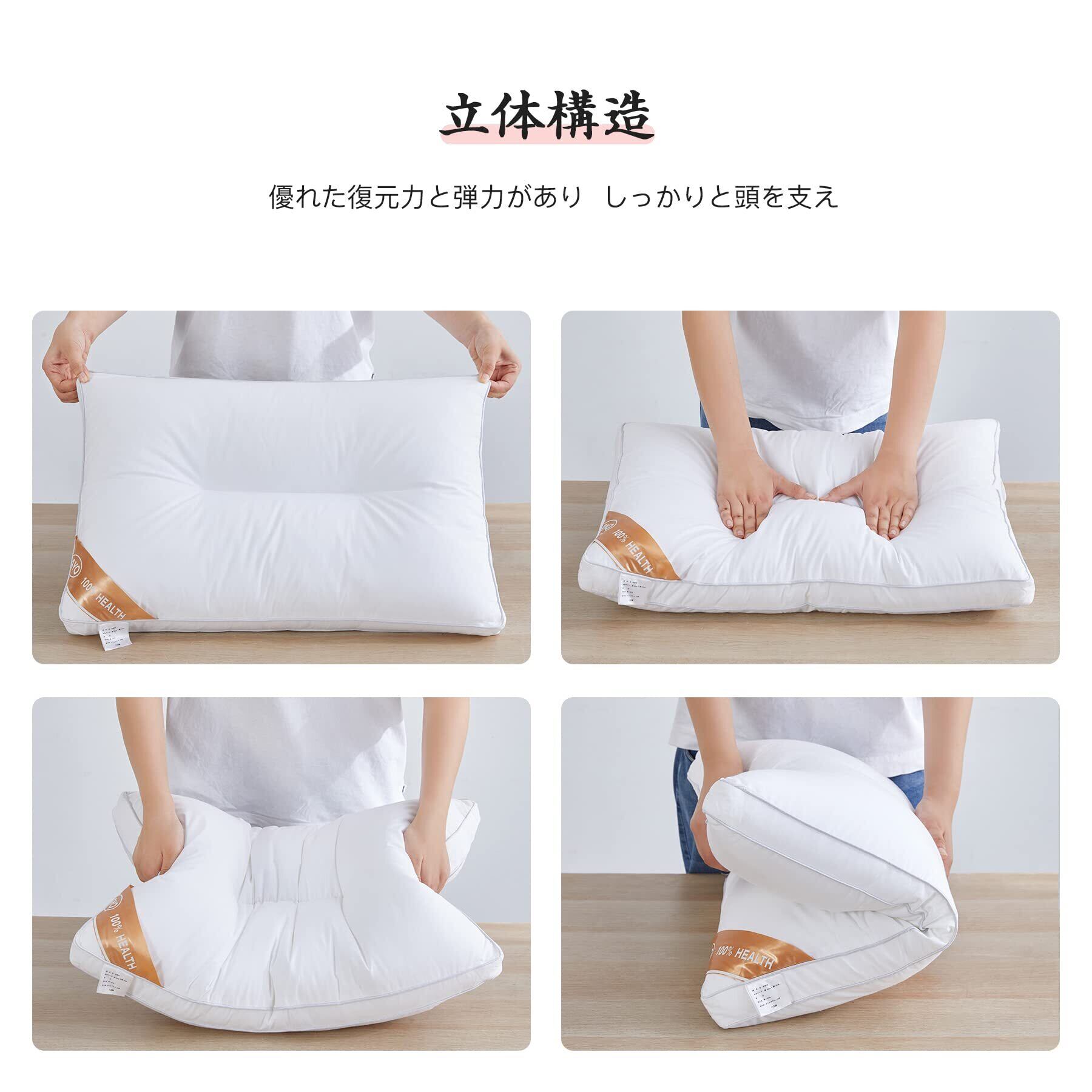 【立体構造】仰向けで寝る場合、首を自然な形にキープして、ぐっすり軽快に眠れます。横向けで寝る場合、肩幅の高さは両サイドの高さにぴったり合うので、首がしっかりと優しく支えられ、肩が圧迫されなくできます。ホテルを利用した時に使ったふかふかの枕ですが、デザインそのままに、自宅で贅沢してみませんか?雄大なボリューム感ふんわり優しく沈み込み、独特でラグジュアリーな寝心地を楽しんでください。