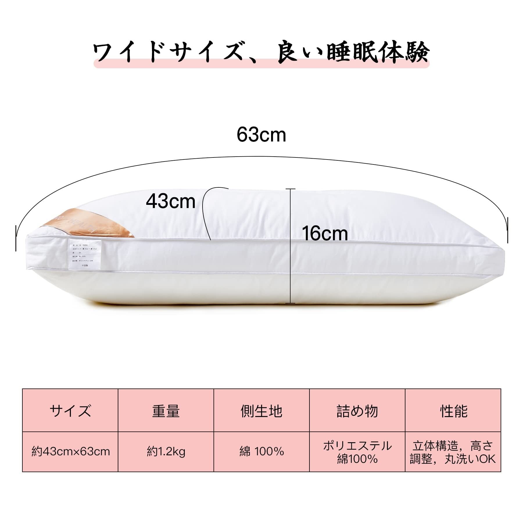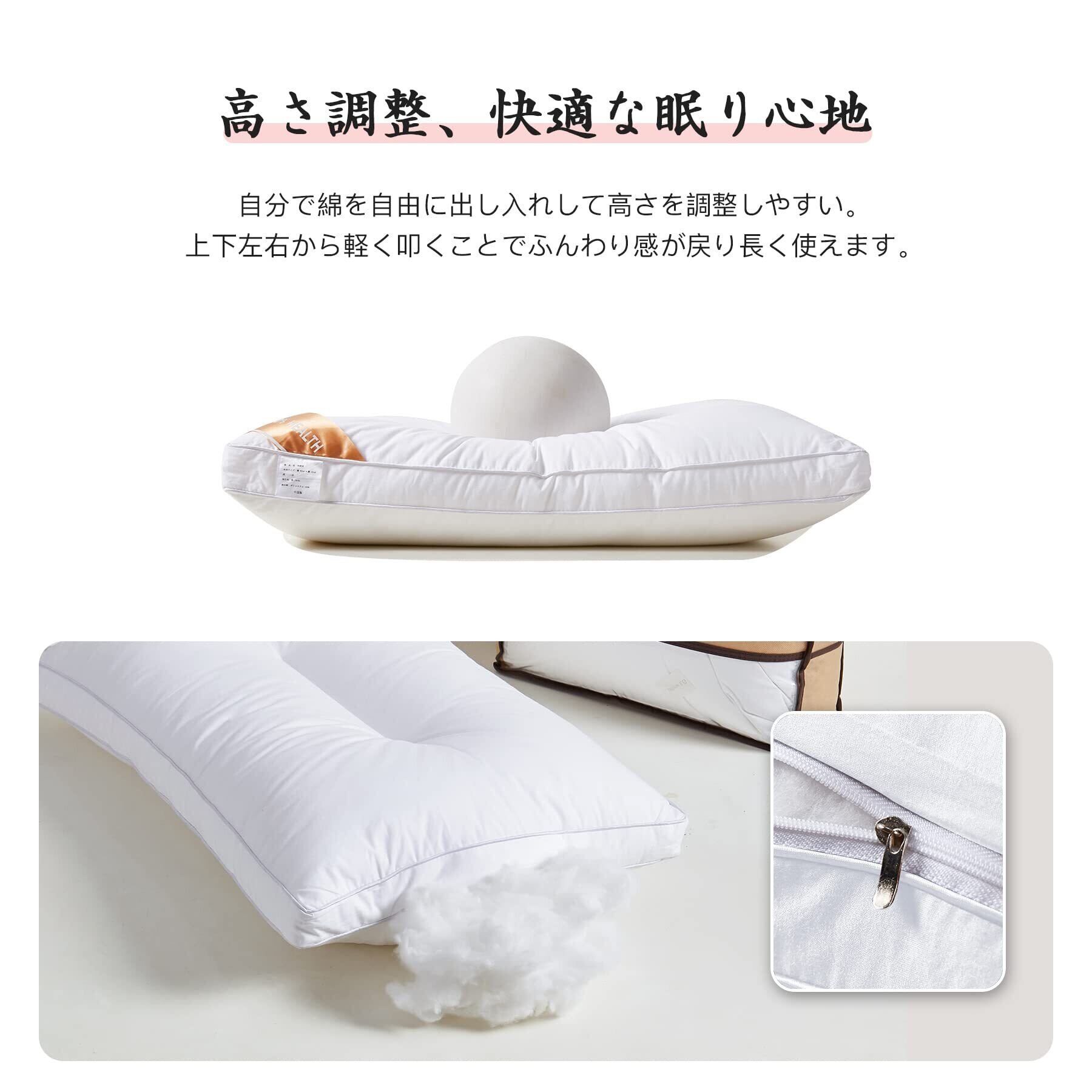 【標準サイズ、高さ調節可能】サイズ:43×63cm。重量:約1.2kg。ワイド幅で寝返りを打っても頭が落ちにくくて、国内の枕カバーに合う使いやすい標準サイズです。ポリエステル100%の詰め物とシャツのようなさらっと肌触りの100%綿の側生地の組み合わせによって生まれた枕です。しかも期待の第二代で高さを調節することが可能です!ファスナーを開けて、綿の出し入れでお好みの高さで調節してください。