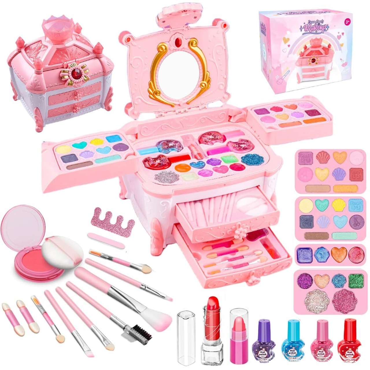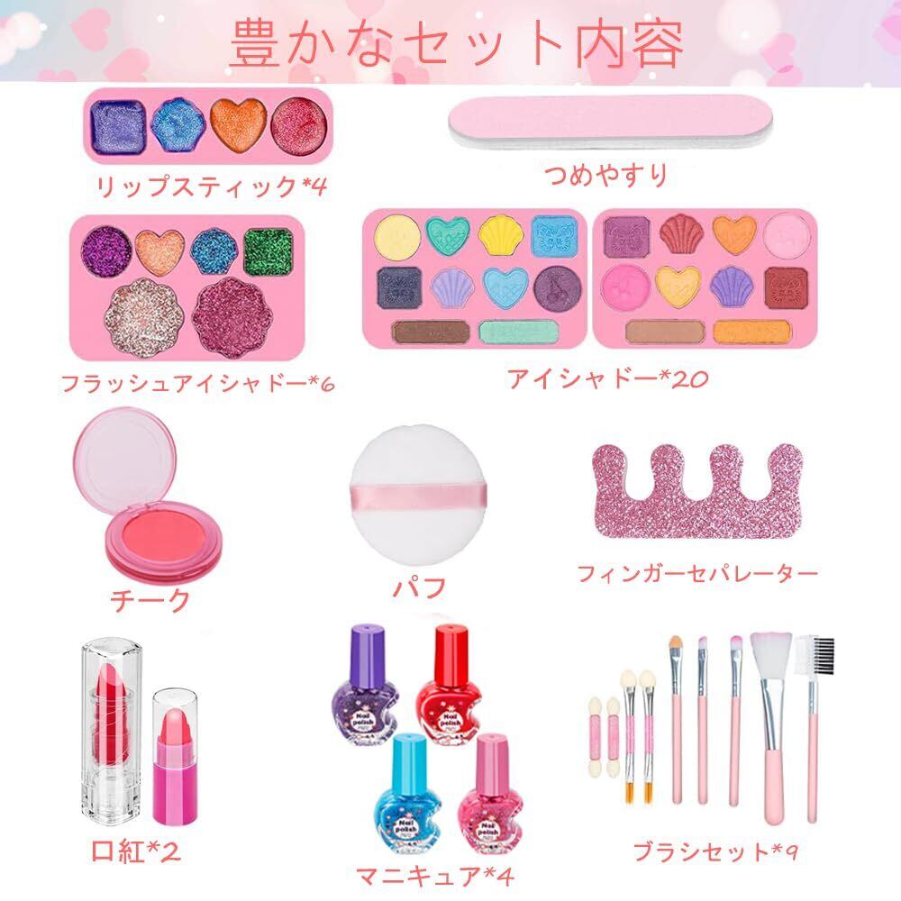 安全・豪華な女の子 真化粧セット内容:化粧バッグ、アイシャドウ、 ネイルポリッシュ、口紅、リップグロス、、化粧ブラシ、ネイルステッカー、ブラシセット、パウダーパフなど。