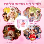 水やせっけんで簡単に落とせるので、 安全で使いやすくお肌にもやさしいところが うれしいポイント。 すべてのメイク用品をコスメバッグにしまって、外出先に持っていきましょう。このセットはお子様を何時間も楽しませること請け合いです!誕生日 クリスマス ハロウィン 七五三などの ちょっとしたギフト プレゼントにもおススメ! ダンスや発表会等にも使えるキッズコスメです。