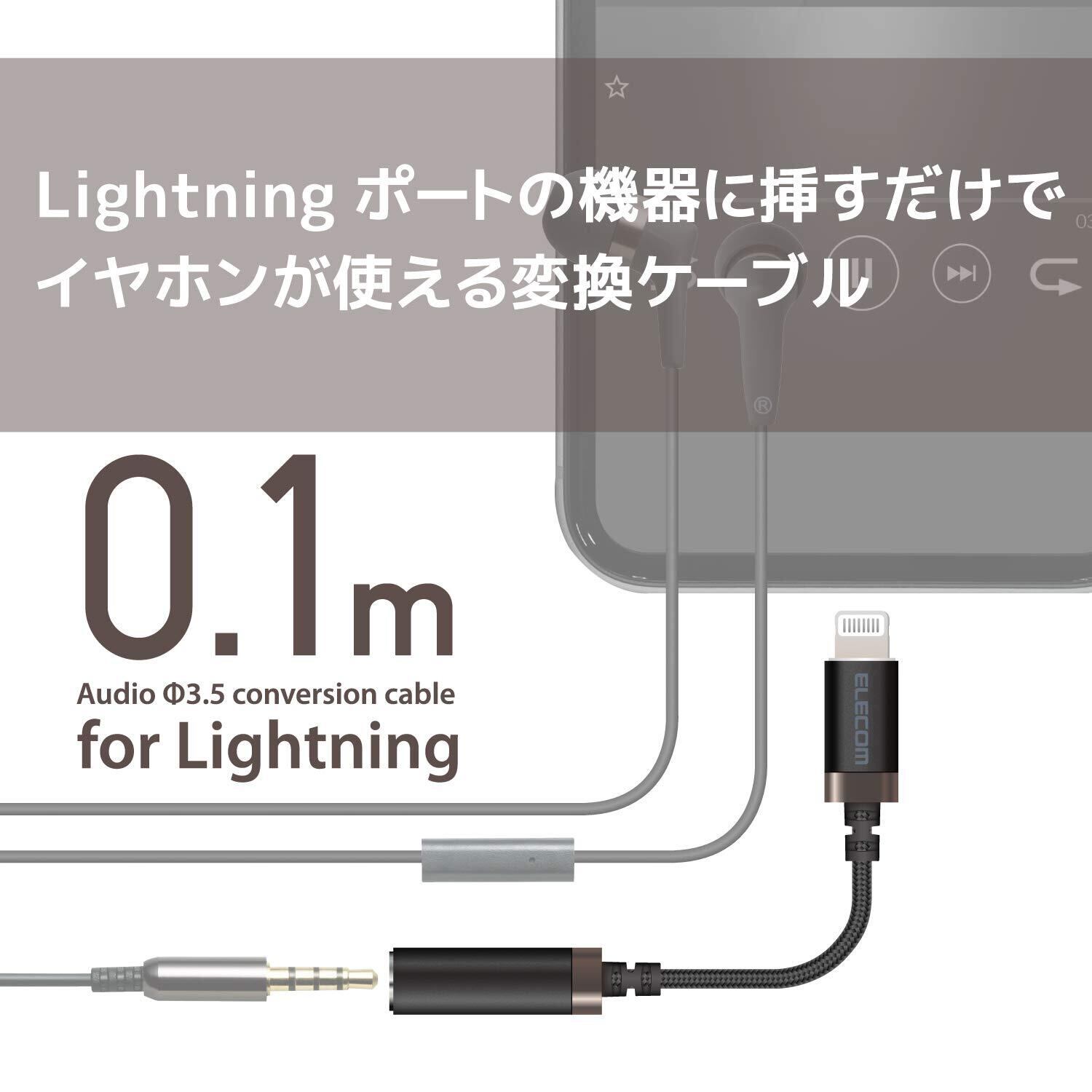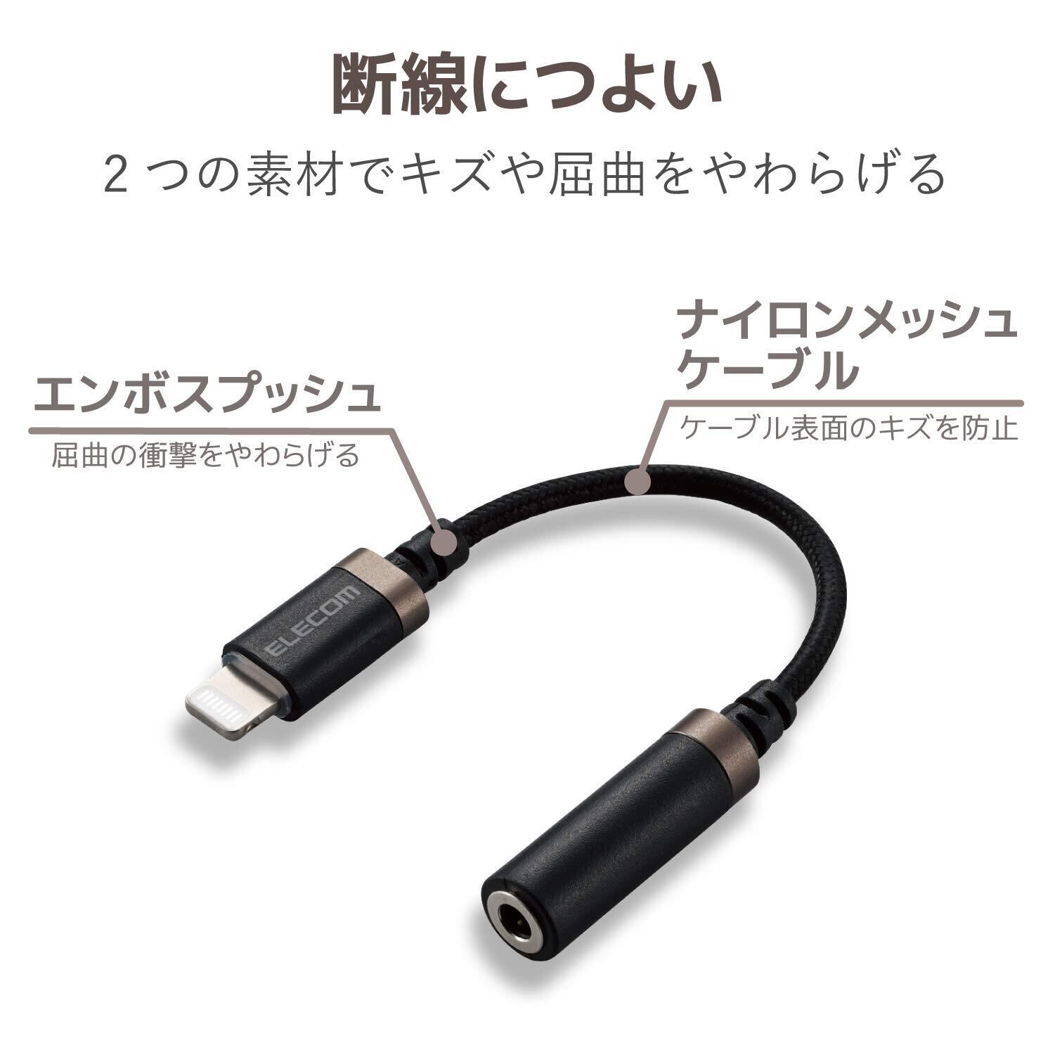 ライトニングコネクタをφ3.5mmイヤホンジャックに変換できる高耐久タイプの変換ケーブルです。