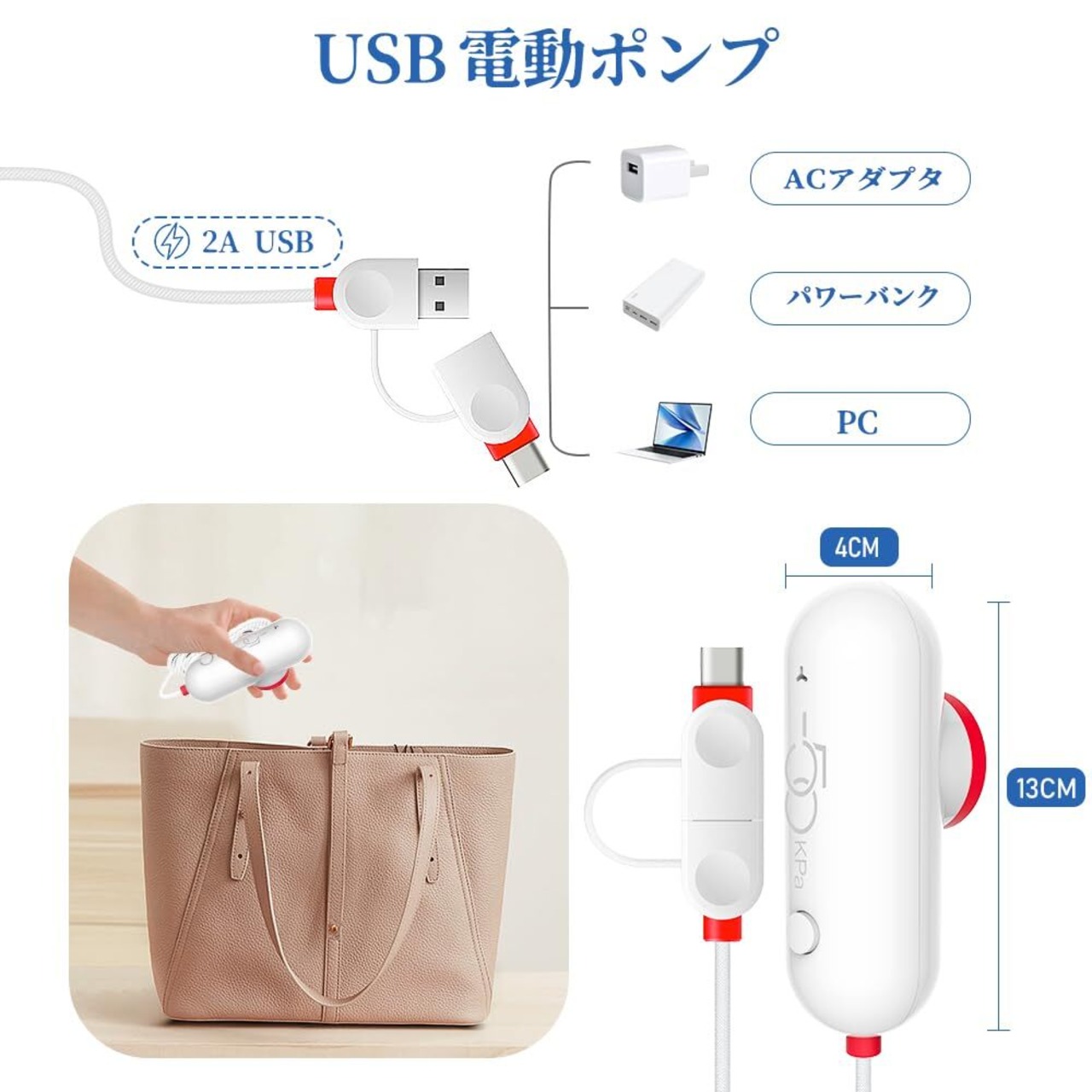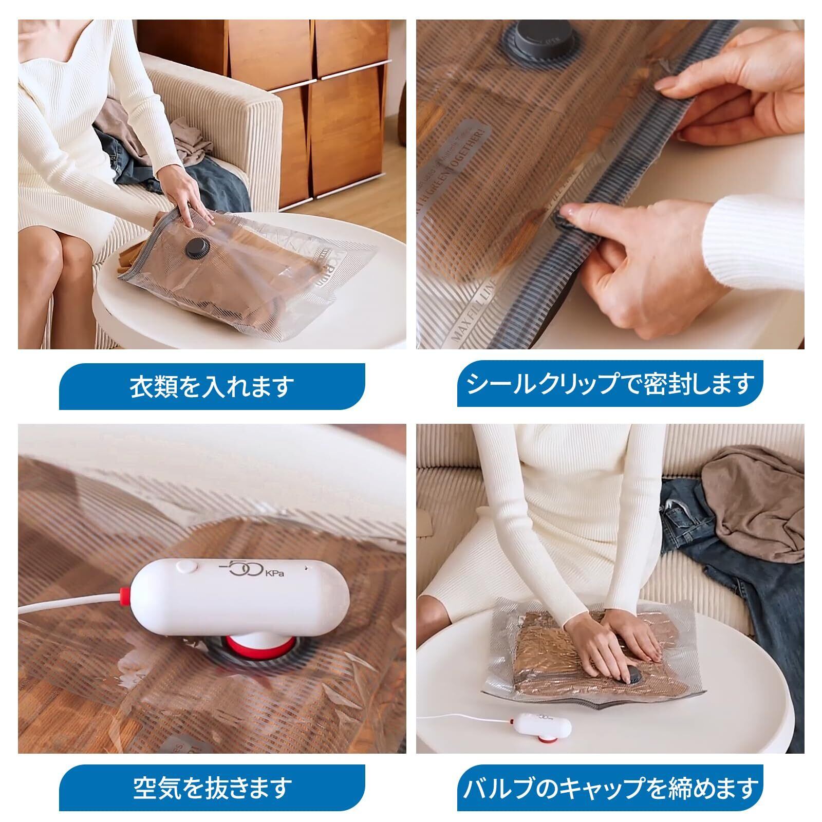 USB 電動ポンプ :この真空ポンプは最高50 Kpaの吸引力があるで、手巻き式のように圧縮袋を密閉しようとして疲れたりすることがない。そこには、2A以上USBを使用ので、電源アダプタやノートパソコン、モバイル電源を使って簡単に給電できる.更に、いつでもどこでも簡単に空気を抜くことができます、出張や旅行先でスーツケースに収納する際も、服をできるだけ小さく・タイトにすることができる.