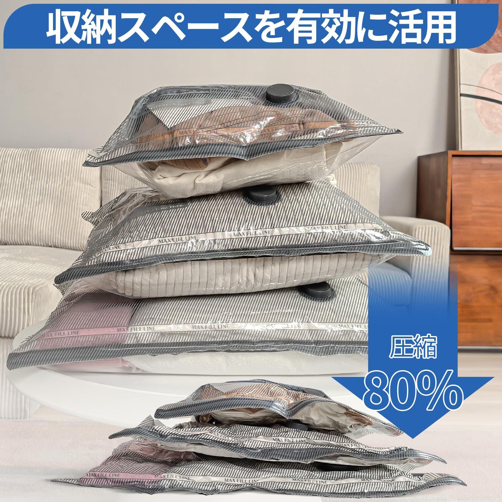 耐久性と再利用可能:真空収納袋はダブルバックルで密封されており、1年間内に空気が漏れないことをします。チャック部分は空気が漏れない二重チャック構造になっています。また、ダニやカビなどの侵入を防ぎ、常に清潔に保管して頂けます。そして、我々の素材がPAとPEの高品質ブレンドから作られています、同じ製品の厚さより30%厚くでき、丈夫で柔らかく、健康的な素材です、何度も再利用できます、