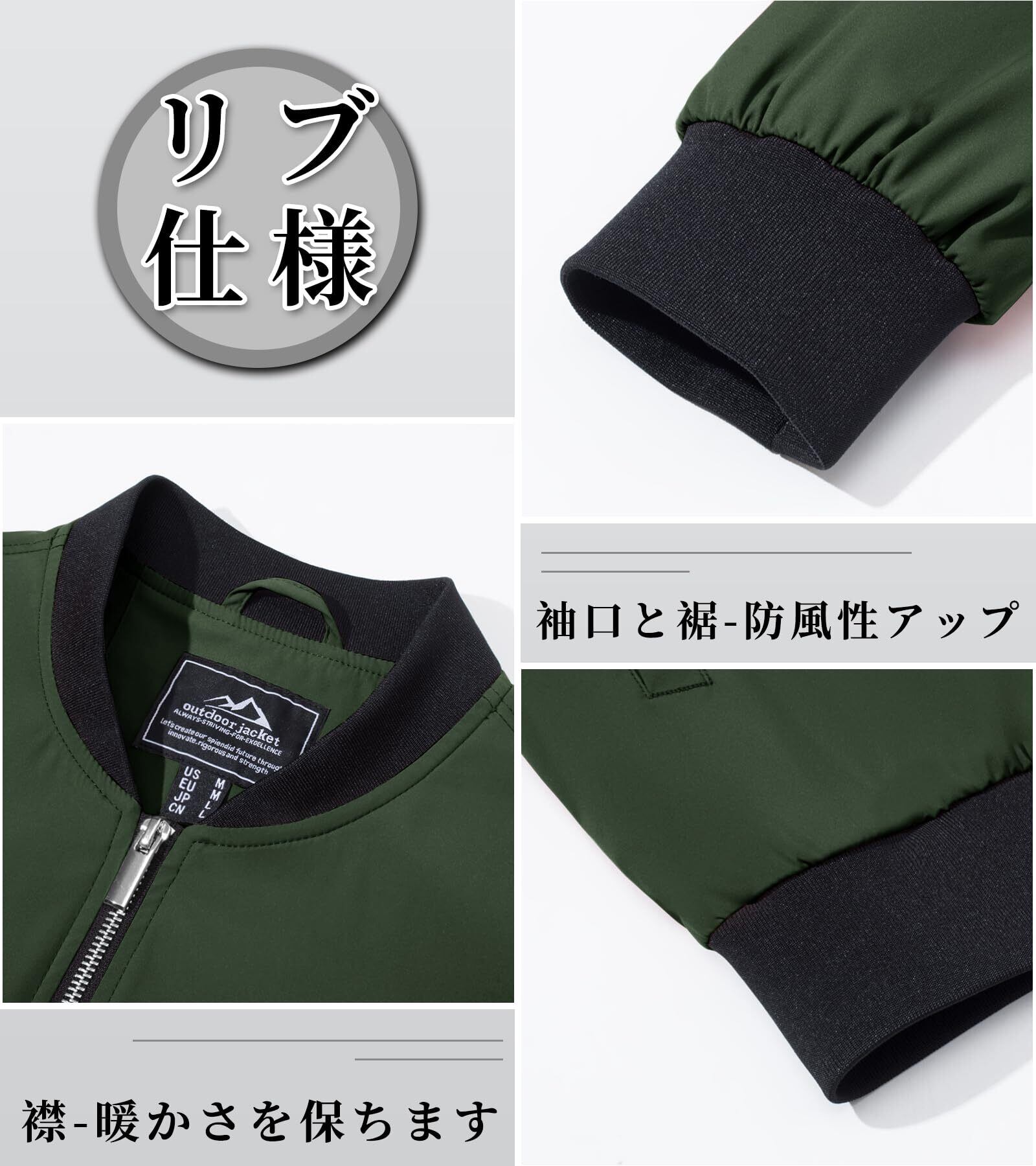 【防風性】ポリ面料を使用しており、柔軟で伸縮性に優れ、体にぴったり合いながらも風をシャットアウトします。リブ仕様の襟、裾、袖口が冷たい秋風の侵入を防ぎ、しっかりと暖かさを保ち、肌寒い季節でも快適に着用できるアウターです