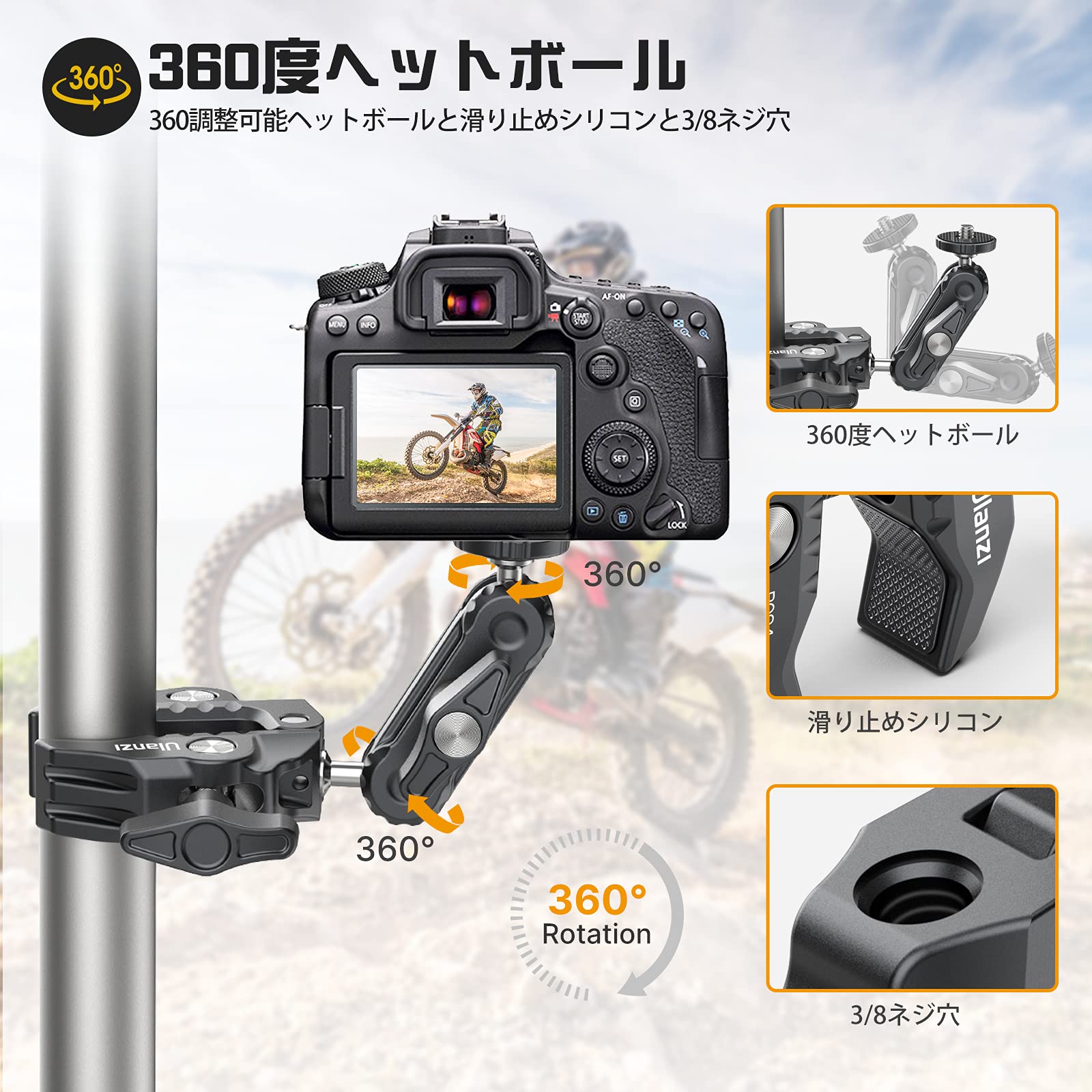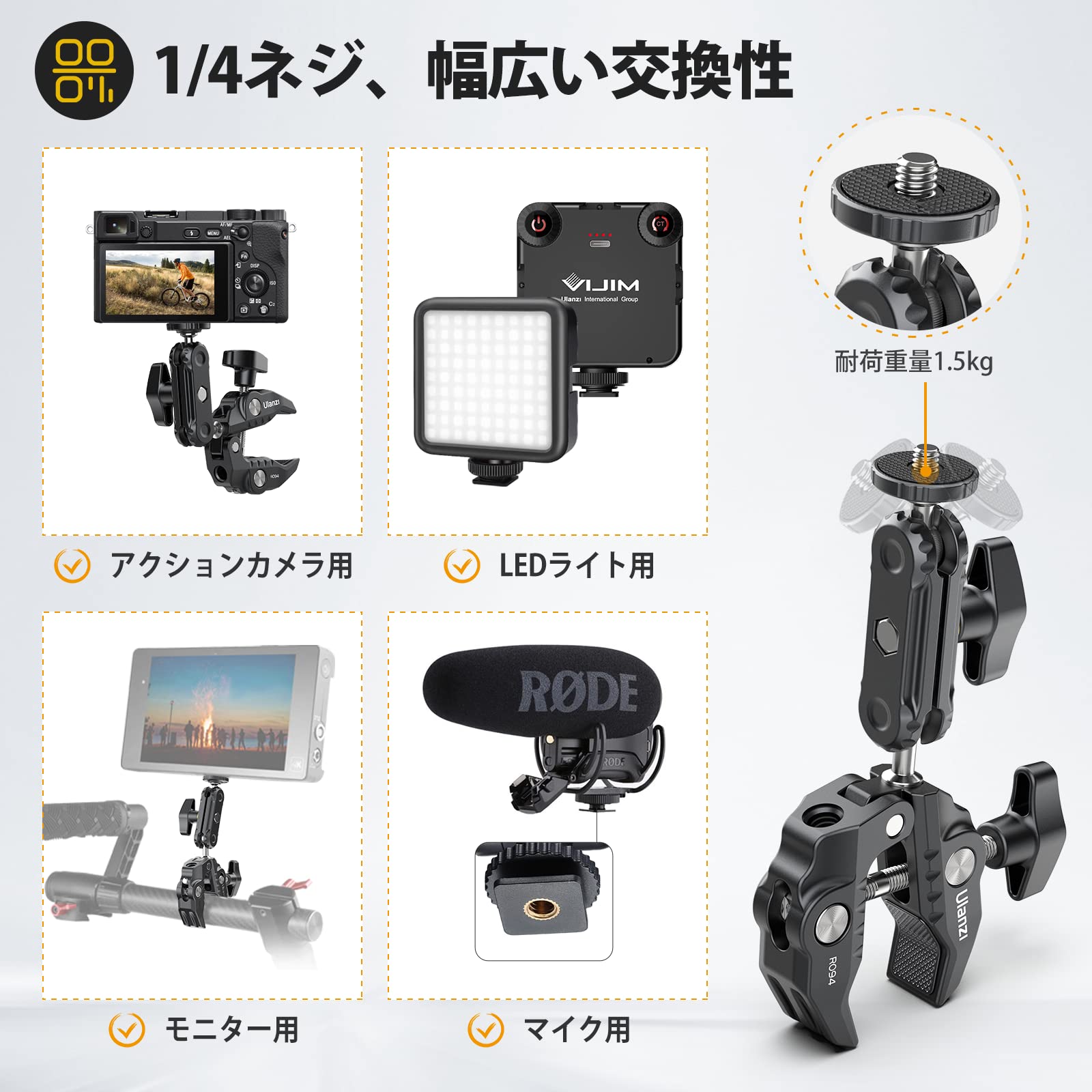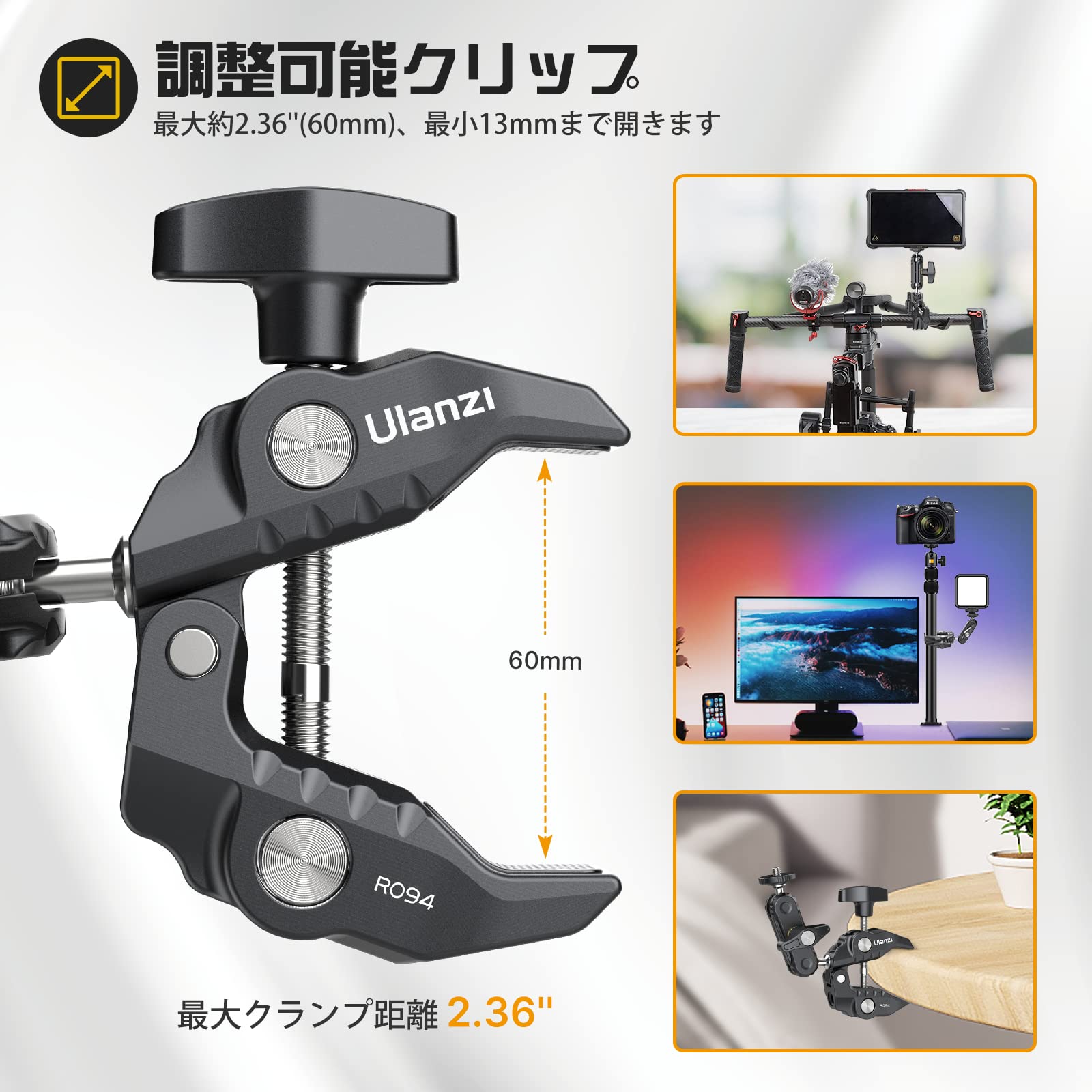 Ulanzi R094 スーパークランプ ボールヘッドアーム 緩み防止 蟹バサミクランプ マジックアーム 360度回転 1/4インチネジ 偏向防止 雲台/撮影 照明機材 固定 デスク アーム バイク ベストアングル プロジェクター ウェブカメラに対応
