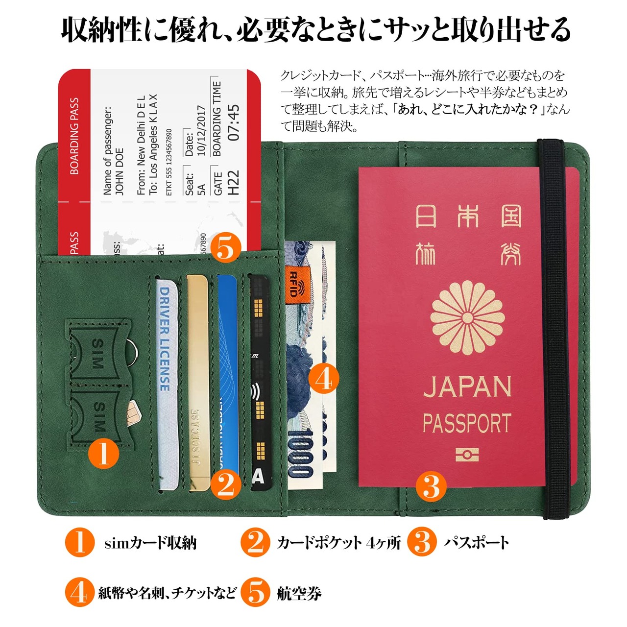 【多機能収納】外側はシンプルですが、内側はパスポート以外にも航空券、紙幣、クレジットカード、SIMカード等を収納できる多機能な作りです。旅先で増えるレシートや半券などもまとめて整理してしまえば、 「あれ、どこに入れたかな?」 なんて問題も解決