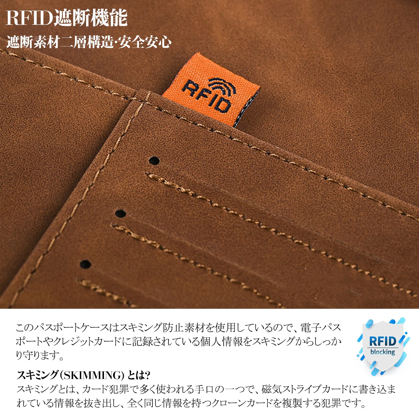 【スキミング防止機能搭載】このパスポートケースはスキミング防止素材を使用しているので、電子パスポートやクレジットカード、キャッシュカードなに記録されている個人情報をスキミングからしっかり守ります