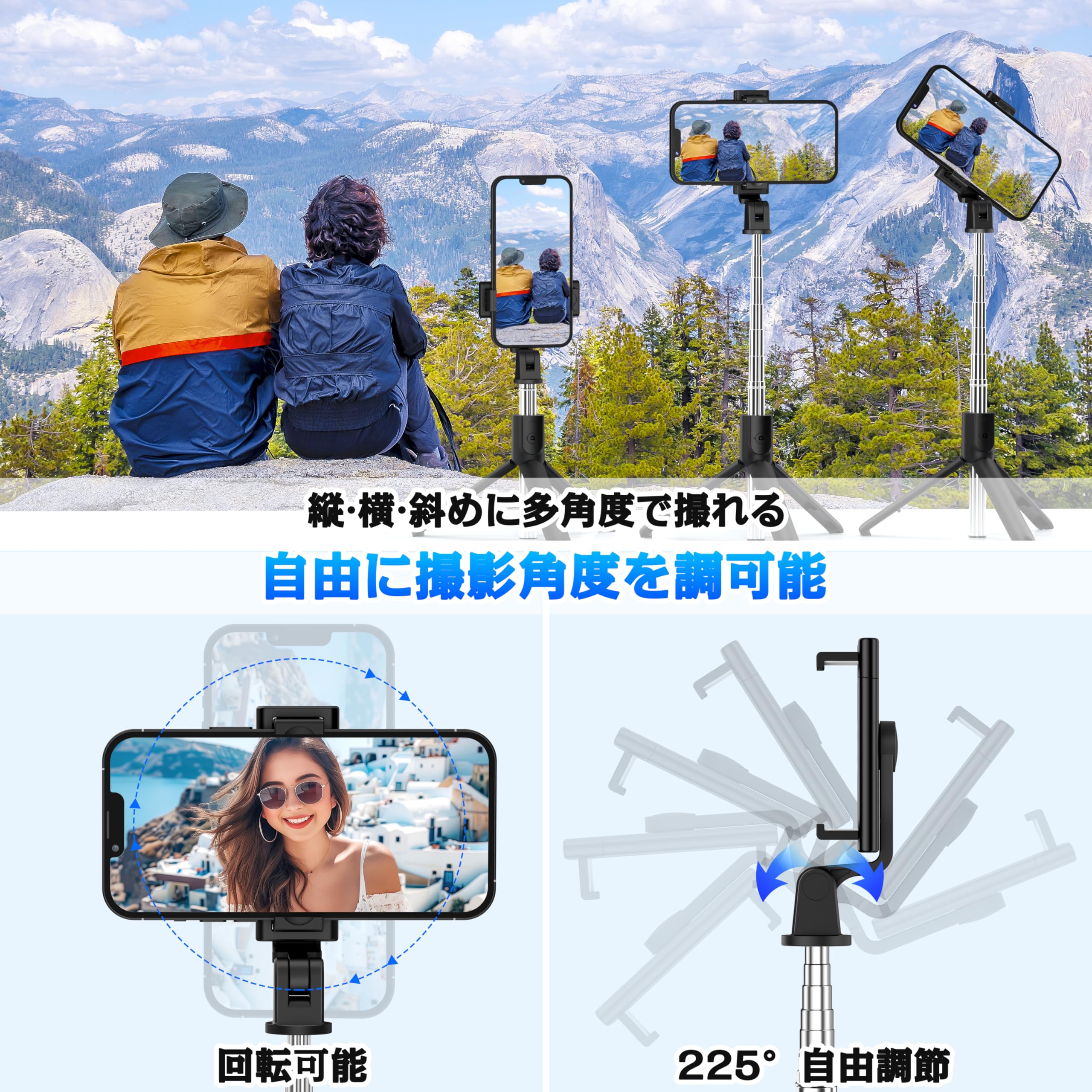 【多用途で撮影を楽しめる】自撮り棒はスマホスタンドとしても利用可能で、動画鑑賞やオンライン会議、集合写真、生放送、オンライン会議などに対応、360度回転するホルダーと225度折りたたみ可能なヘッドで、縦横さまざまな角度の調整からの撮影が楽しめます