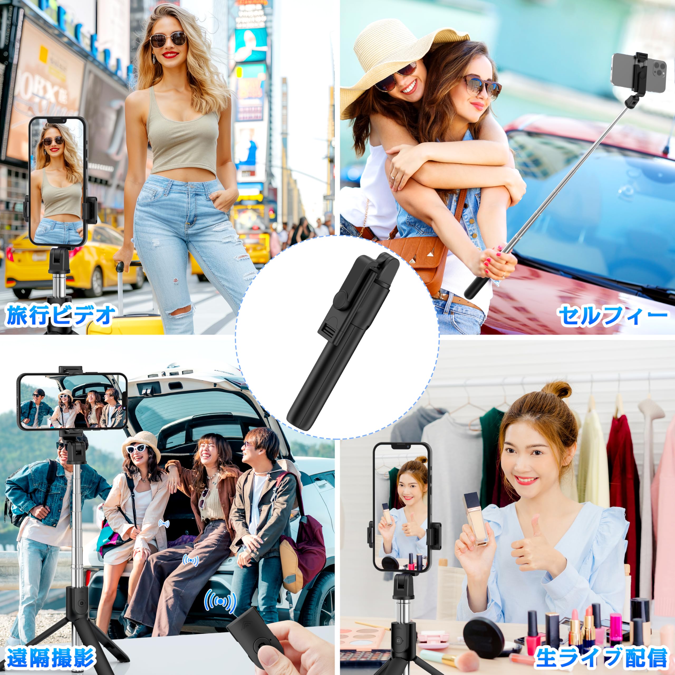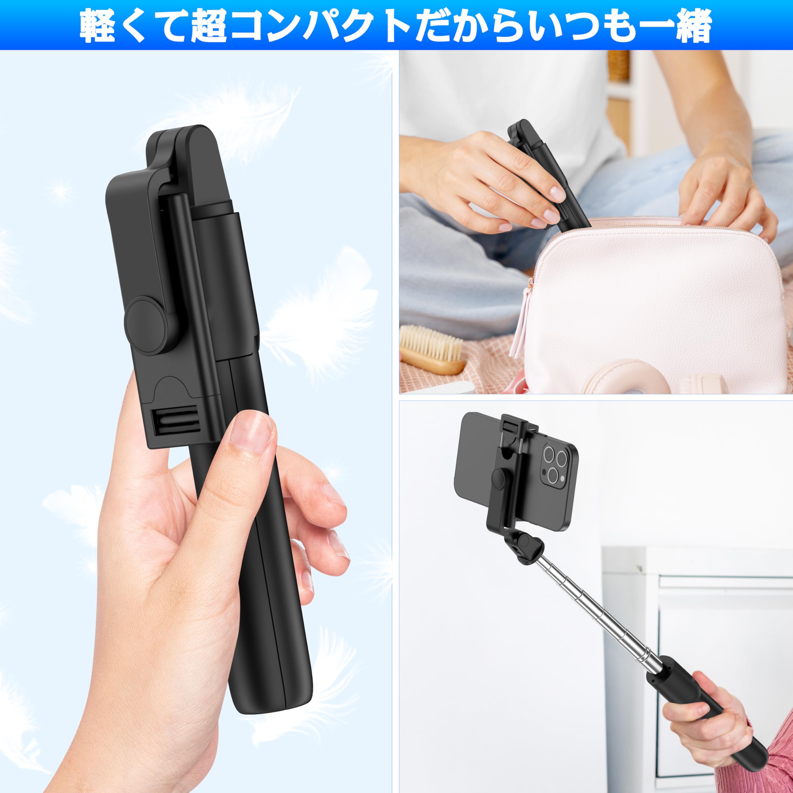 自撮り棒・じどり棒・スマホ三脚 103cmまで伸縮可能・ブルートゥース5.2リモコン付き【360°回転・軽量・折りたたみ式】iPhone6-16Pro Max/Android対応・安定性アップ・日本語取扱説明書付き【コンパクト・7段階伸縮・セルフィー/撮影/生配信/動画鑑賞対応】(ブラック)