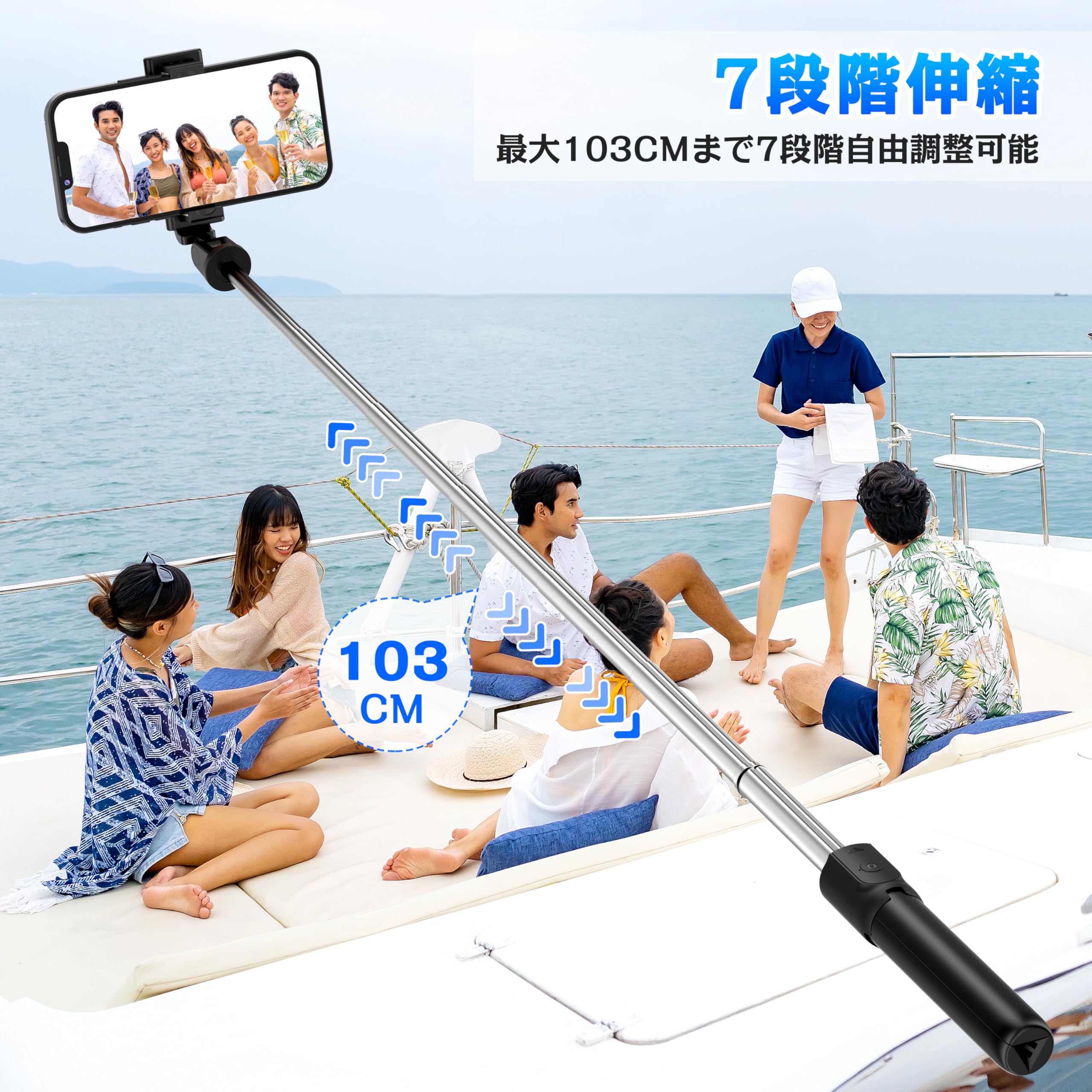 【ポケットサイズながら広い撮影範囲】自撮り棒は折り畳むとわずか19.3cmで、ノートよりも小さく、約103cmまで7段階に伸縮可能なロングタイプで、携帯性と撮影範囲の両方を兼ね備え、家族や友人との大切な瞬間にいつでも取り出せるようにポケットに入れて、素晴らしい瞬間を手軽に記録できます