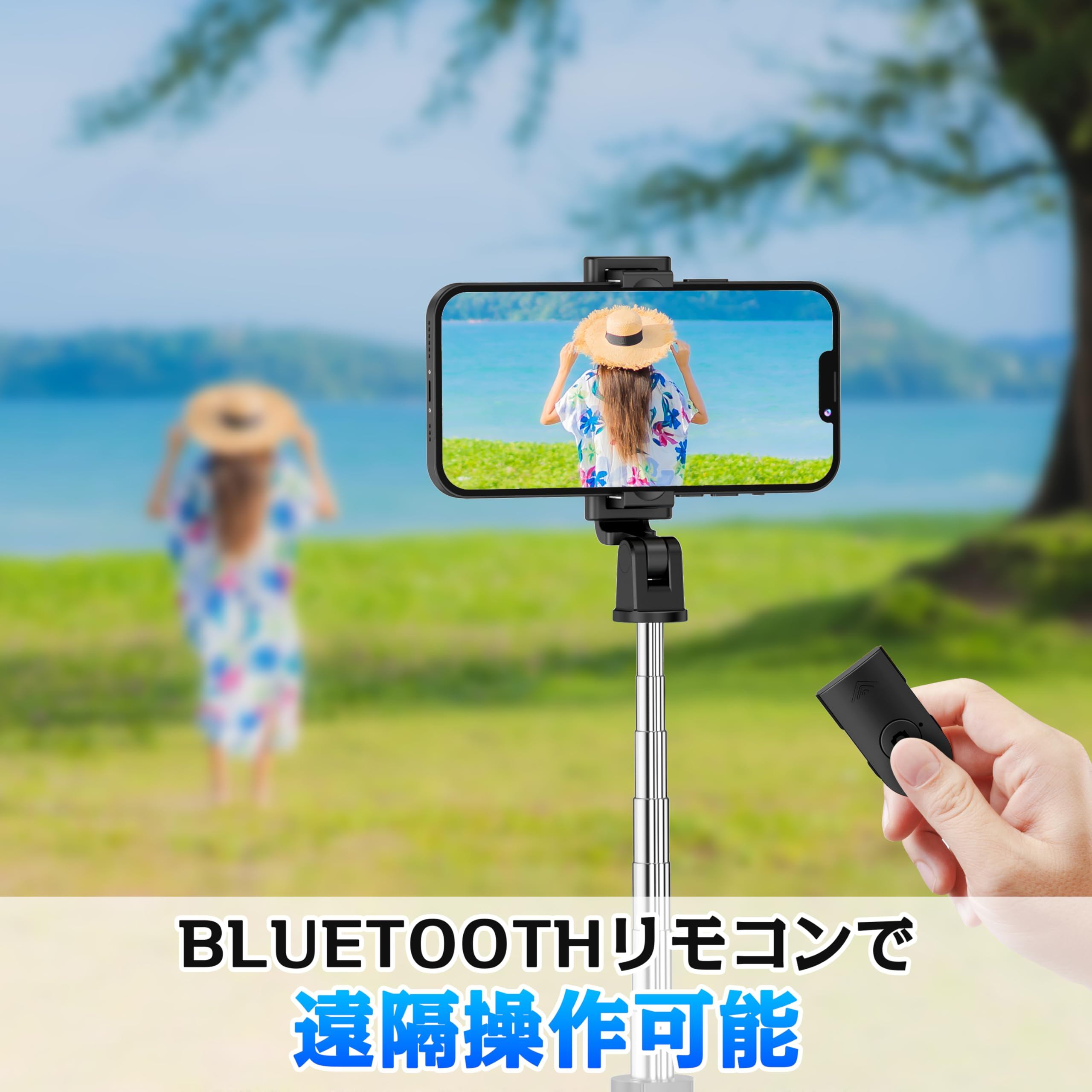 【業界最先端Bluetooth5.2、瞬時に接続】自撮り棒は最先端ブルートゥース技術を採用し、三脚式じどり棒がリモコンが付きて、シャッターボタンを押すだけで、15m以内の遠隔操作可能、アプリも要らなく、初期設定でペアリングが必要ですが、一度設定すれば自動接続して、iPhone、Androidなど写真を撮る際の遅延がなく、安心に使えます