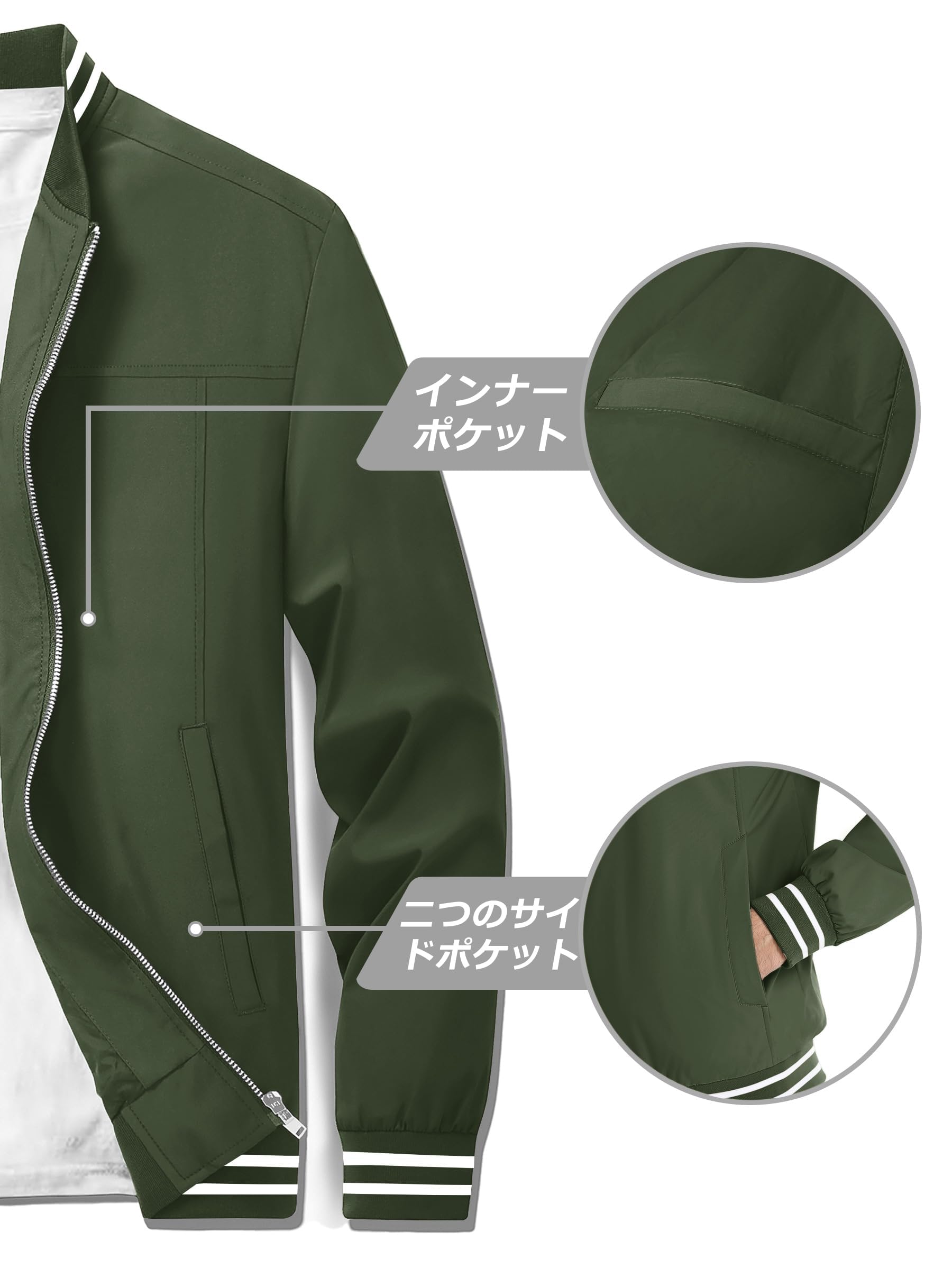 【実用性】サイドにポケットが2つ、インナーにポケットが1つ、日常の収納ポケットがあり、出かけ時に小物を安心に入れます。襟、袖口と裾はリブ編み仕様のデザインが、フィットして動きやすい、防風性も高めます。