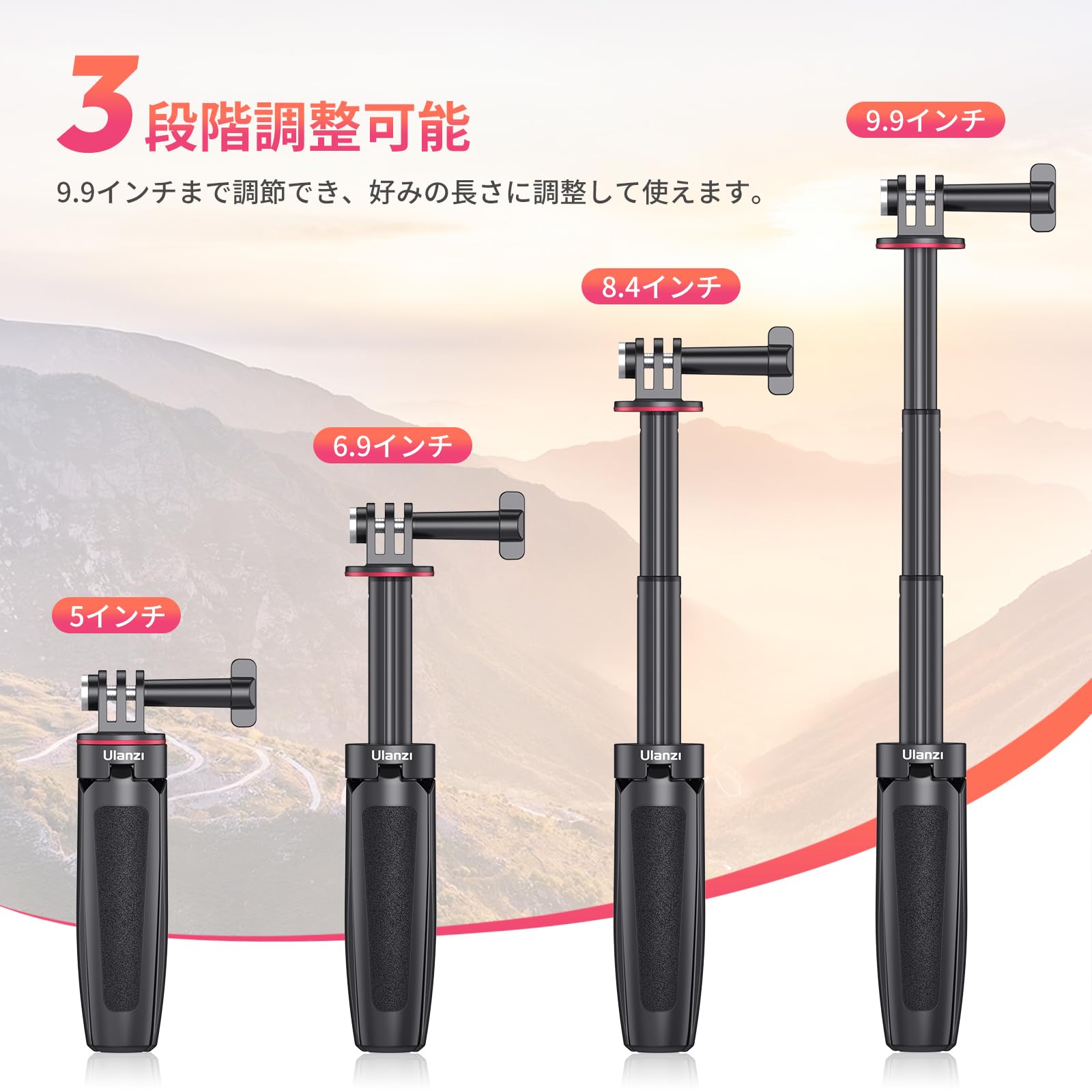 【3段階伸縮】自撮り棒は3段階の高さを調節でき、縮長は5インチから最長9.9インチまで伸ばすことができます。