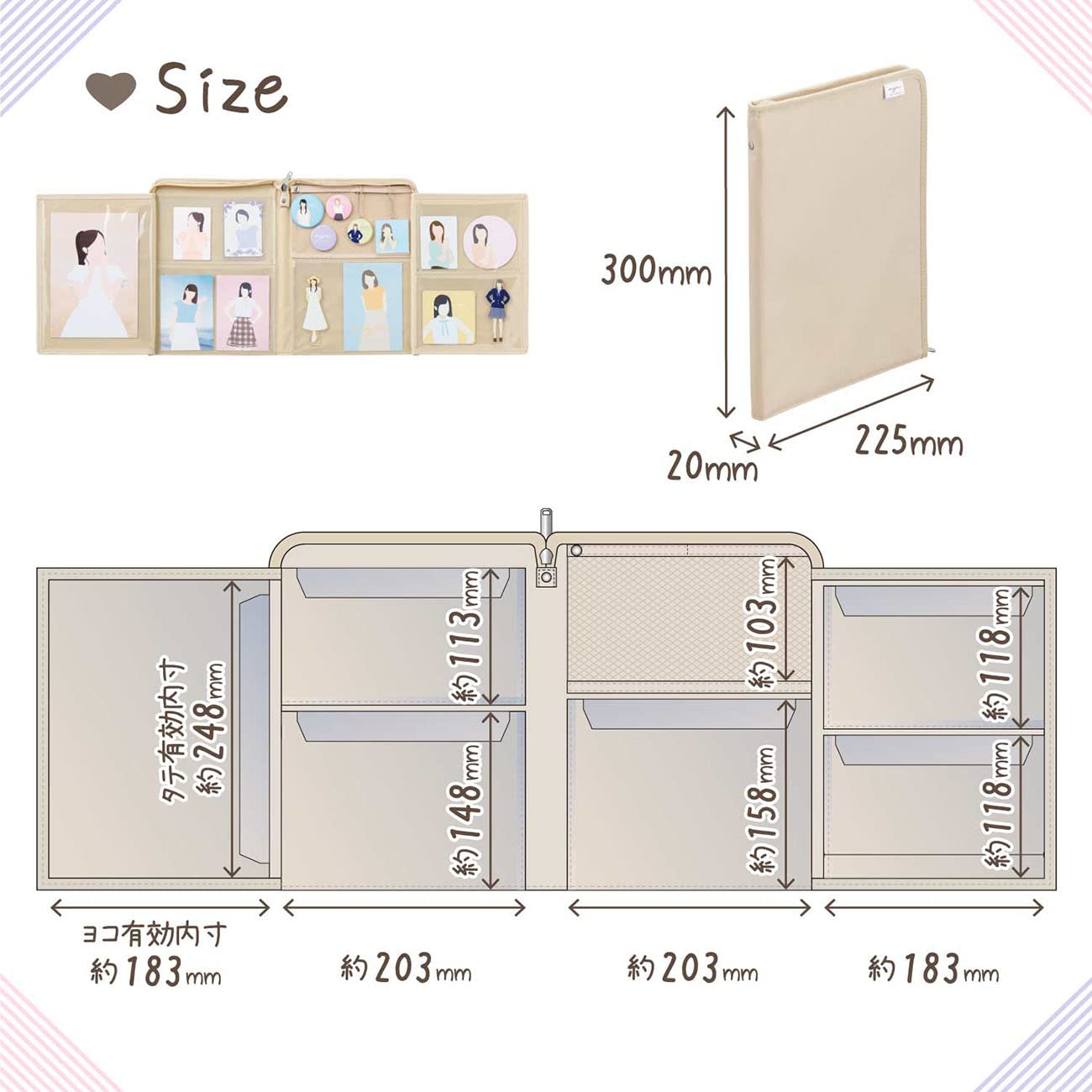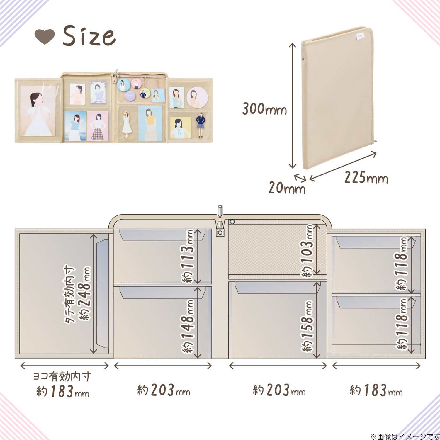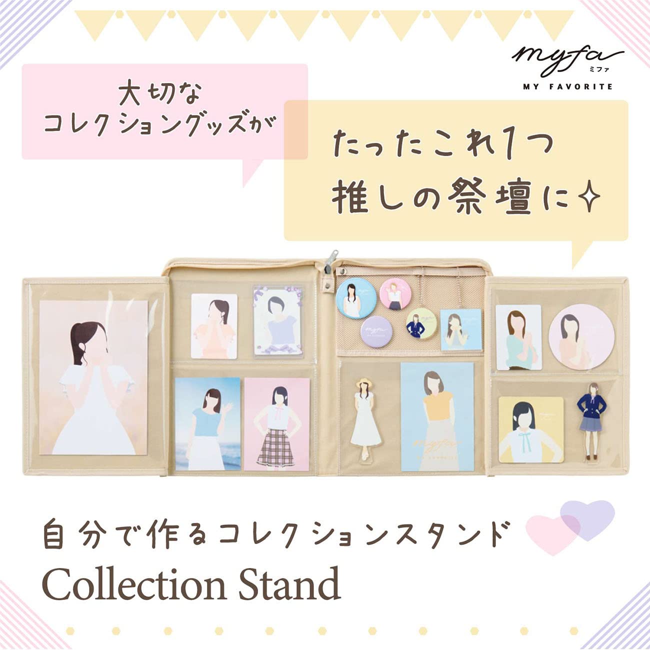 推しの祭壇としてコレクションを立てて飾れます。収納物のとび出しを防ぐフラップ付き。