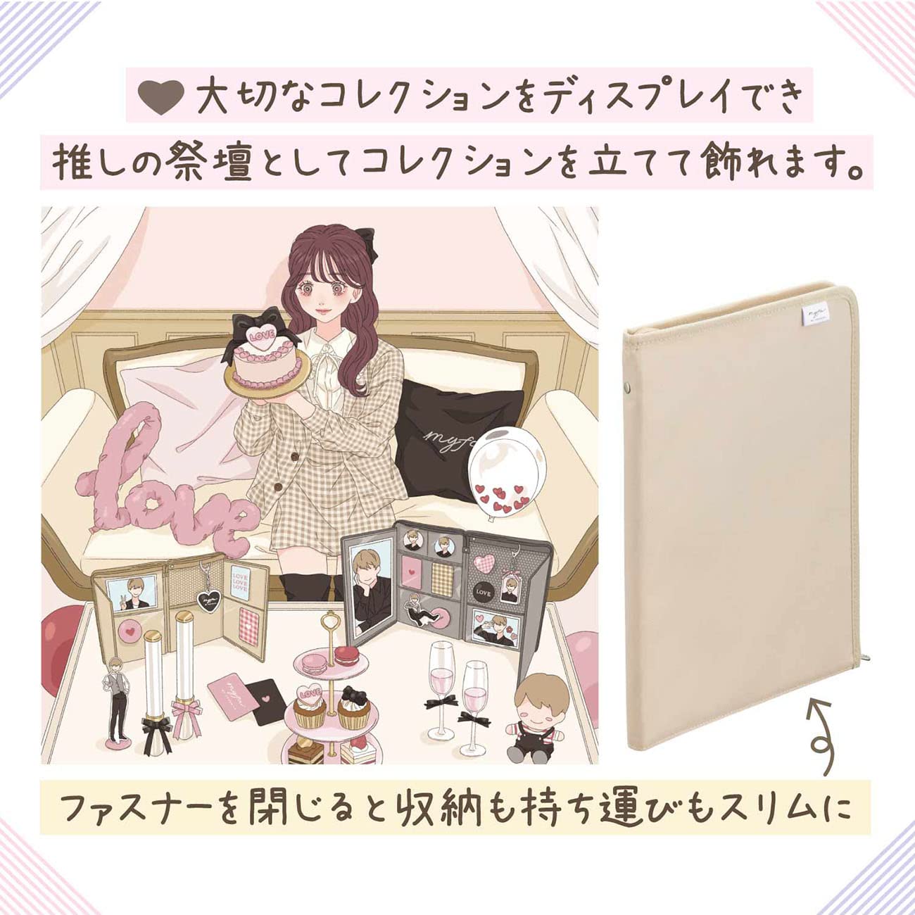 大切なコレクションをディスプレイでき、ファスナーを閉じるとスリムに収納。