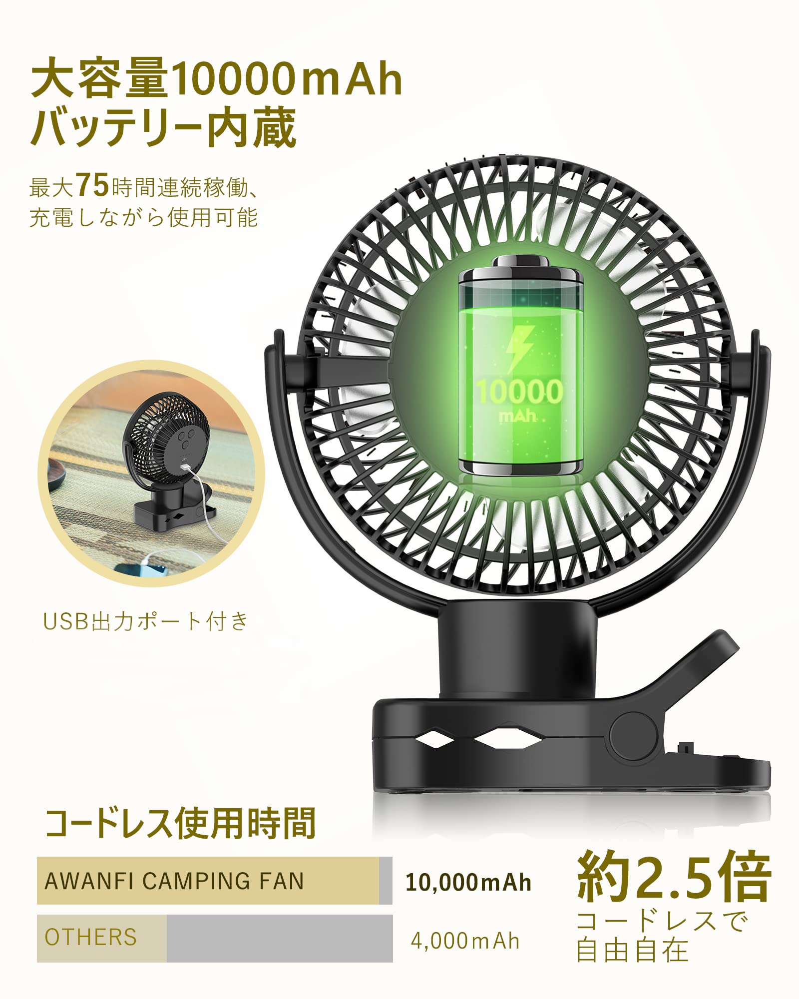 10000mAh電池内蔵、長時間稼働可能:こちらのポータブル扇風機は10000mA大容量バッテリー内蔵で、1回のフル充電で、省エネモードは最大75時間使用可能、強風モードでも15時間連続稼働可能。従来の小型扇風機に比べて、コードレス使用時間が約2.5倍延ばします。また、USB出力ポート付き、アウトドアに大活躍。