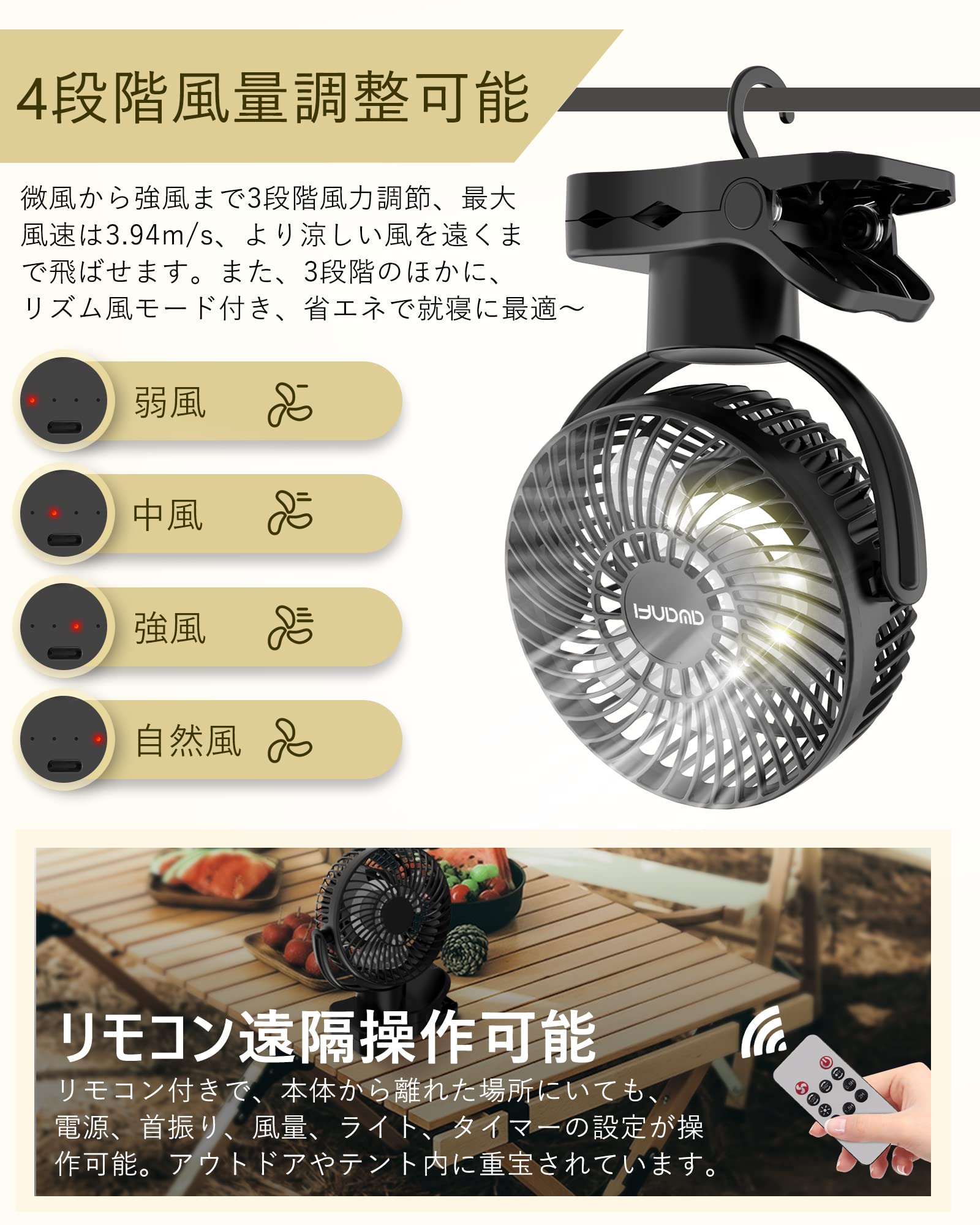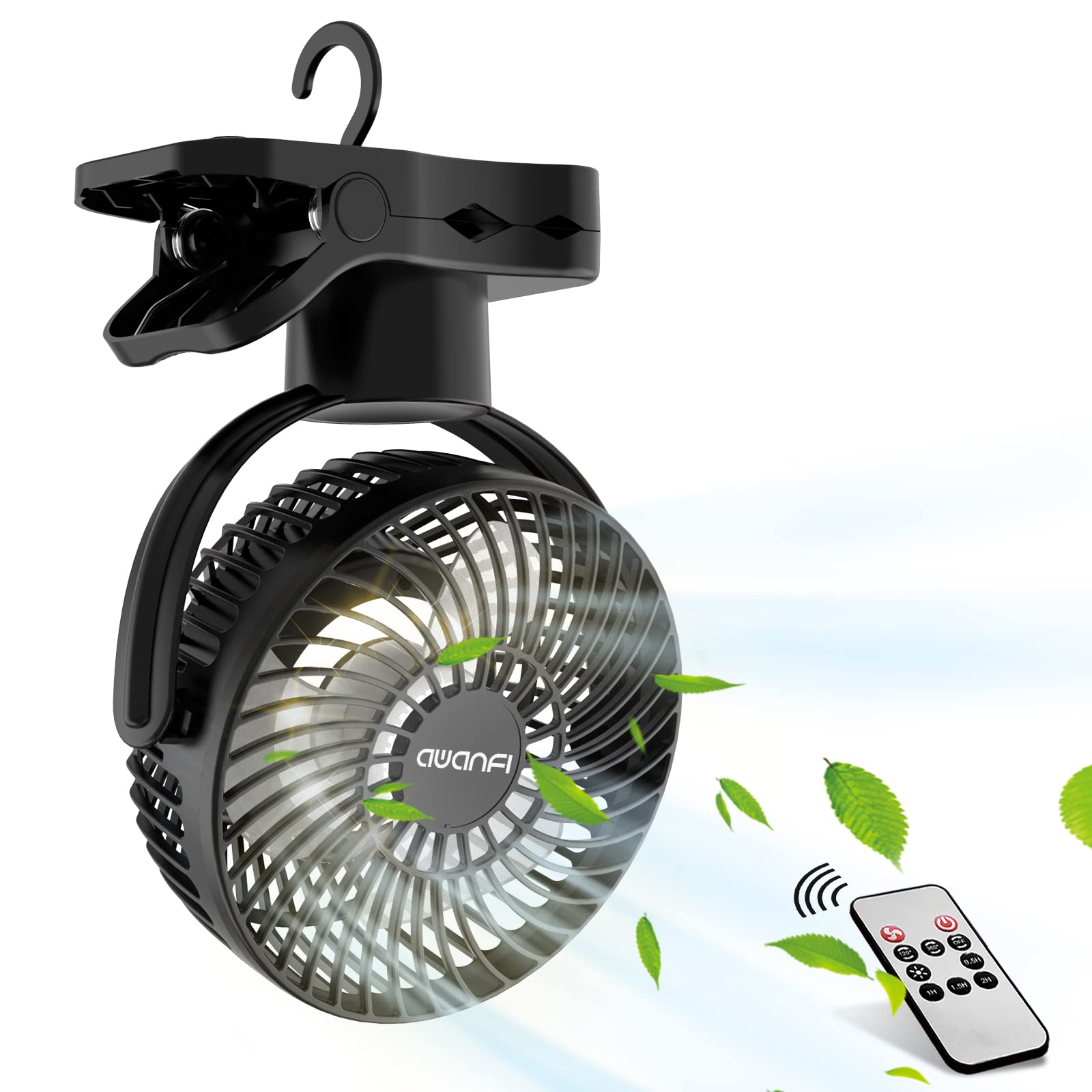 【360度自動首振り・10000mAh 】キャンプ 扇風機 クリップ 卓上 吊り下げ USB充電式 リモコン付き 静音 小型 風量調節可能 LEDライト搭載 キャンプ アウトドア 黒 AWANFI