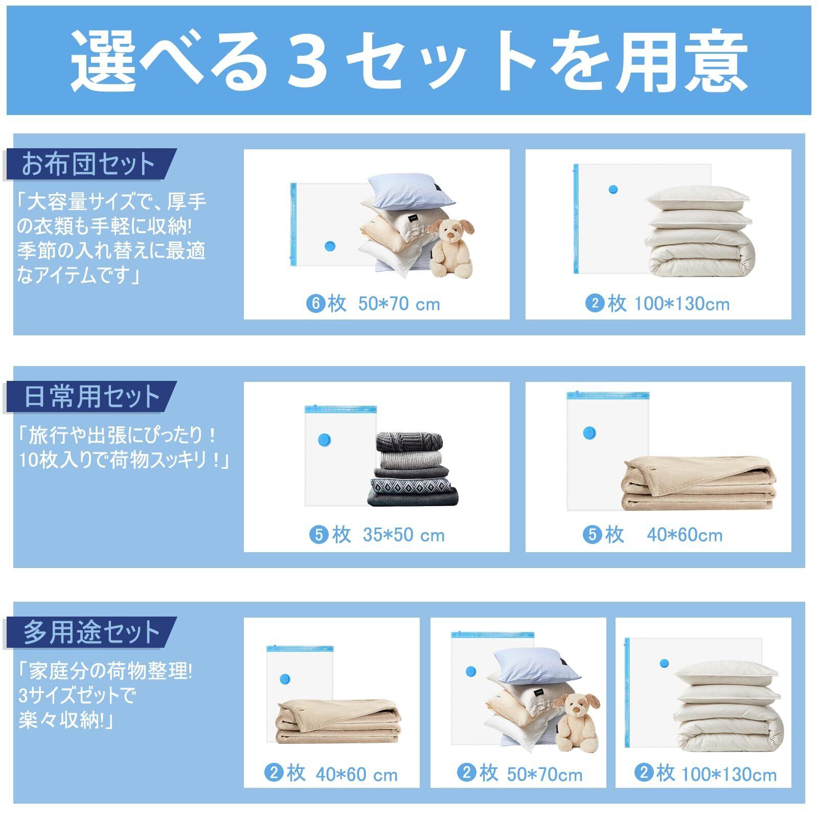 【サイズ】:40×60cm × 6枚、50×75cm × 2枚、100×130cm × 2枚とコードレス電動ポンプが含まれています。布団や毛布、大型衣類の圧縮から、日常使いの衣類やタオルまで、幅広いアイテムに対応。旅行や引越しの荷造りにも便利で、さまざまなシーンで活躍します。