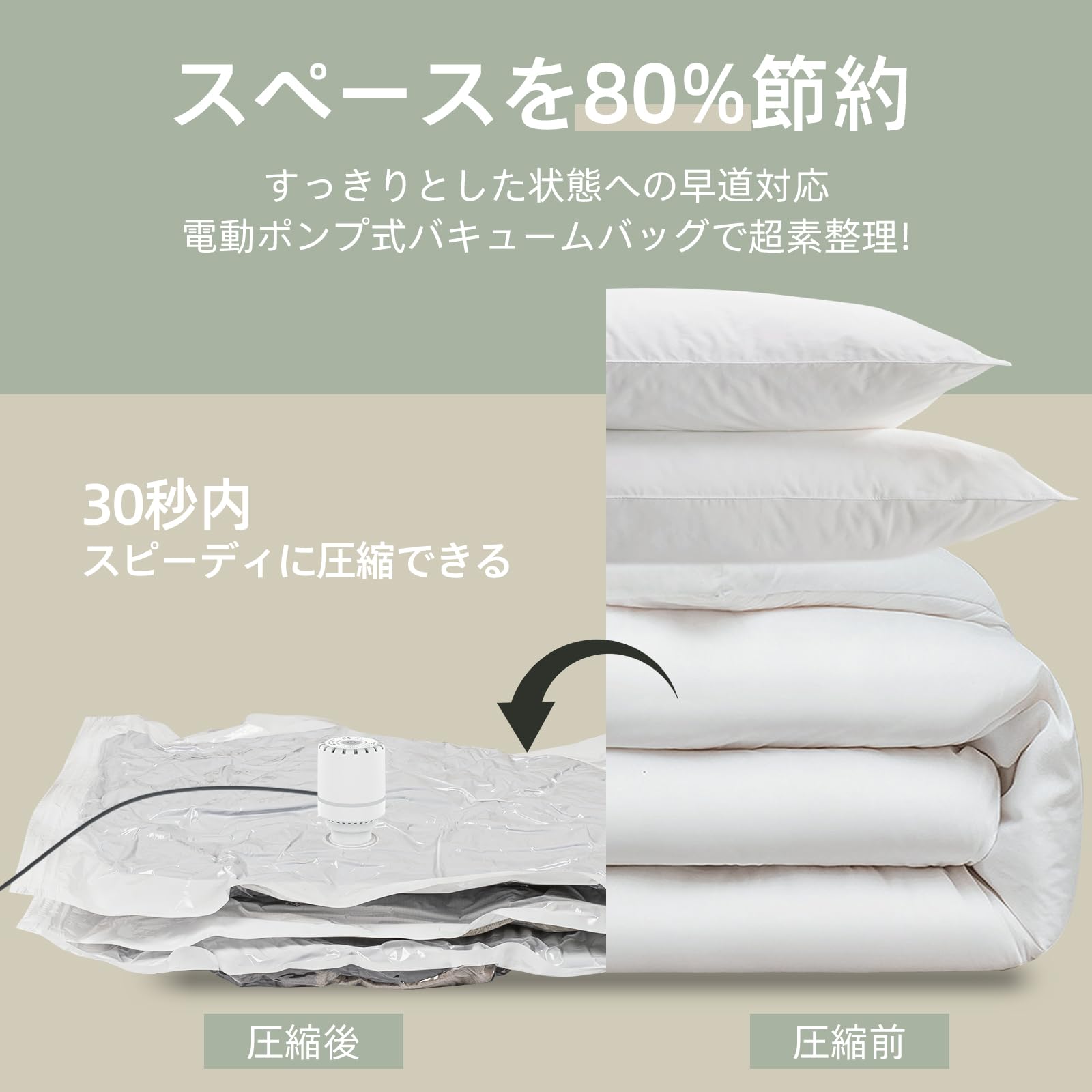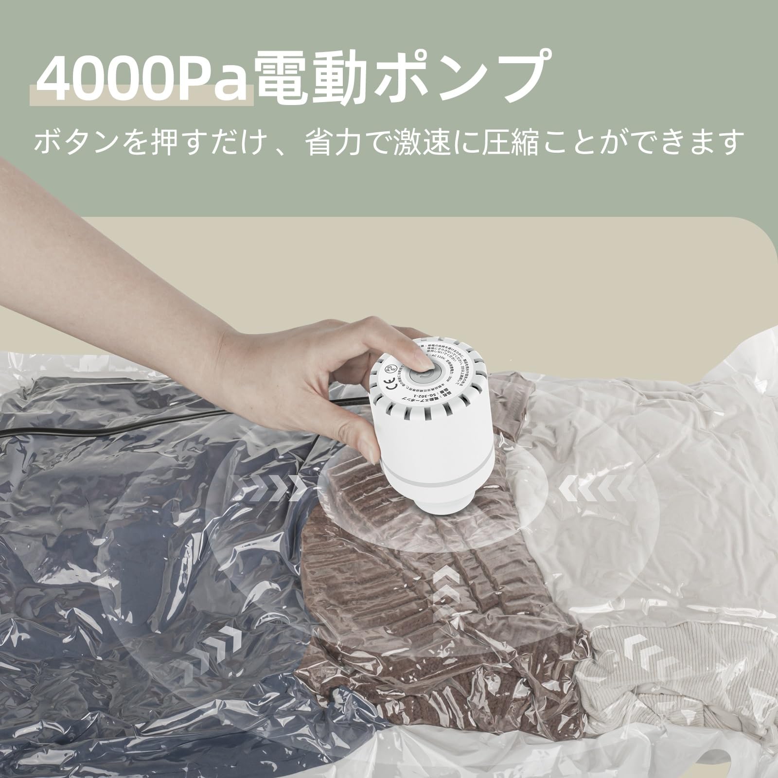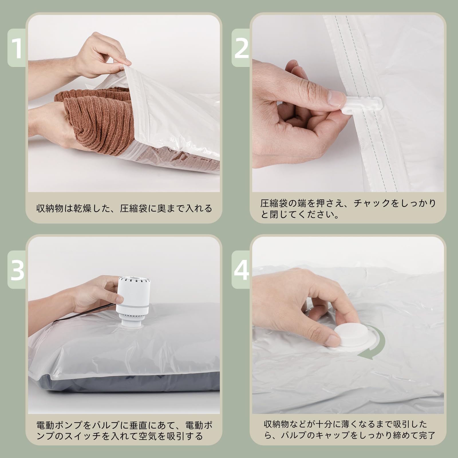 【強吸引力 電動ポンプ付き】 4000 paの強力な吸引力なの電動ポンプで、余分な空気を抜いて、湿気や細菌、ホコリなどを隔離で、ポンプを何度も引っ張ったり押したりする必要はありません。ソケットにプラグを差し込み、バルブにセットしてスイッチを入れ、数秒待つだけで完了です。掃除機不要にも最適です。