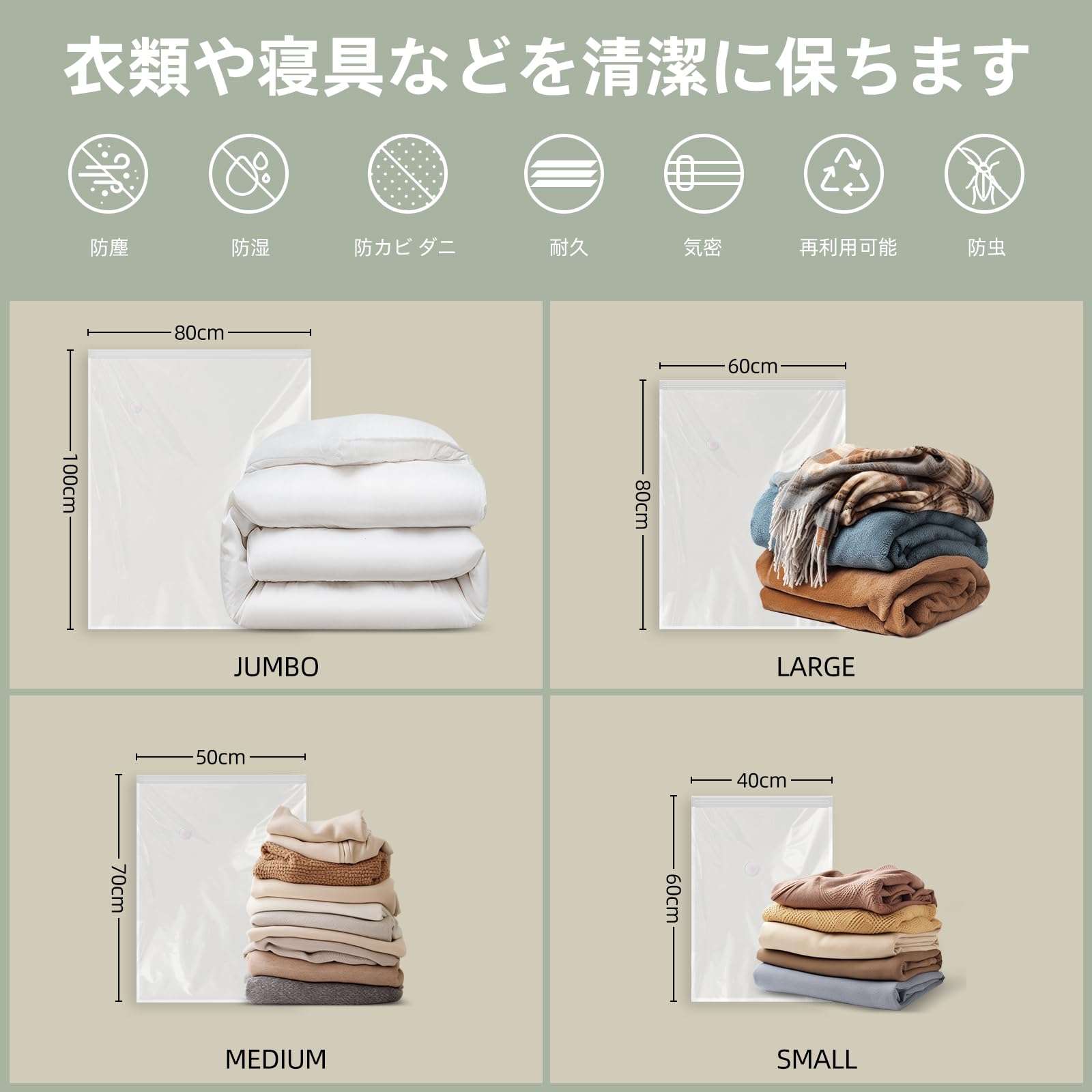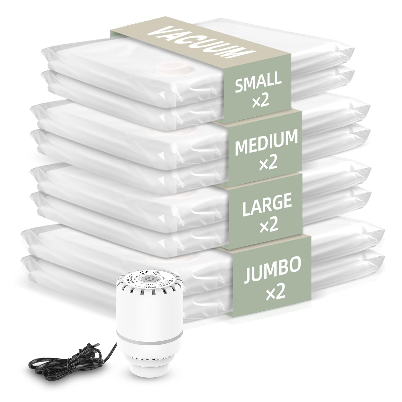 【4サイズ8枚セット】圧縮袋8枚入、サイズ: 100×80cm×2枚、80×60cm×2枚、70cm×50cm ×2枚、60×40cm ×2枚+1個電動ポンプ付き