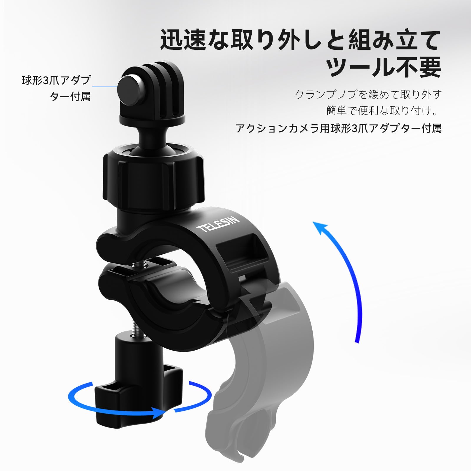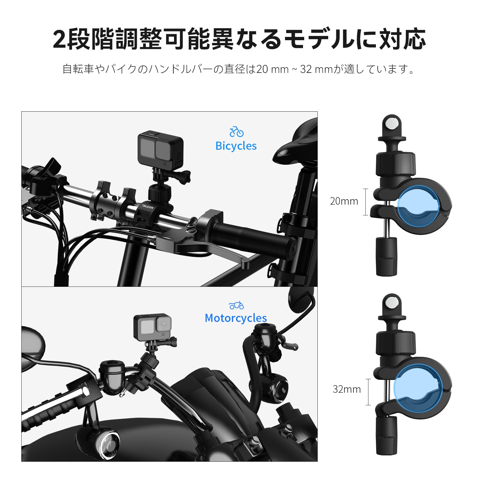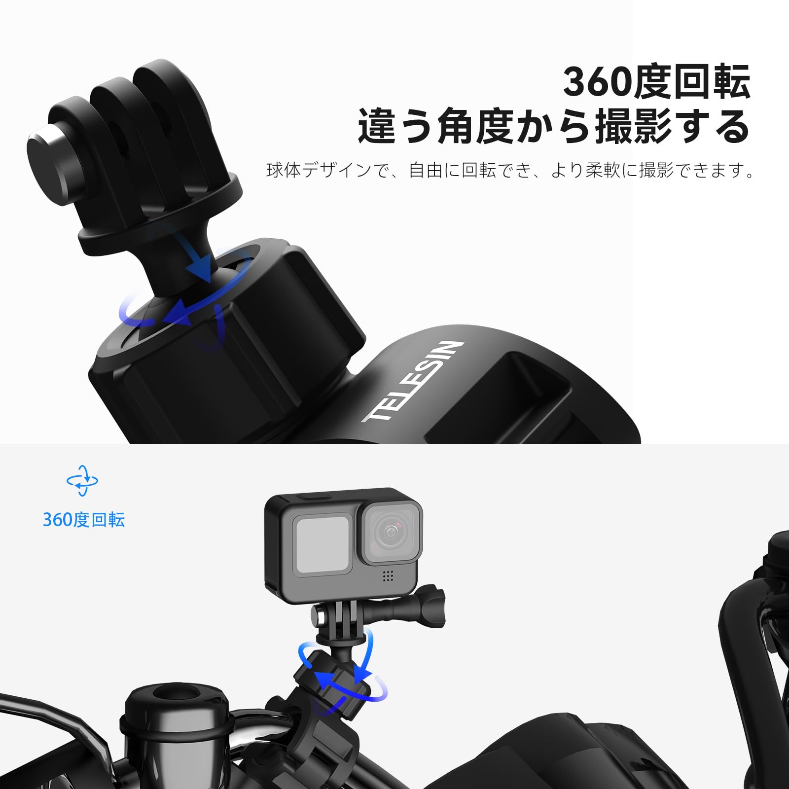 TELESIN バイクマウント オートバイのハンドルバーマウント 自転車ホルダークリップ アクションカメラリグ 360°回転スーパークランプ GoPro Hero 13 12 11 10 9 Black AKASO Insta360 X5 X4 X3 One RS X2 Ace Pro Go2 DJI Action Osmo 5 Pro 4 3 Pocket 3に対応 20mm-32mm