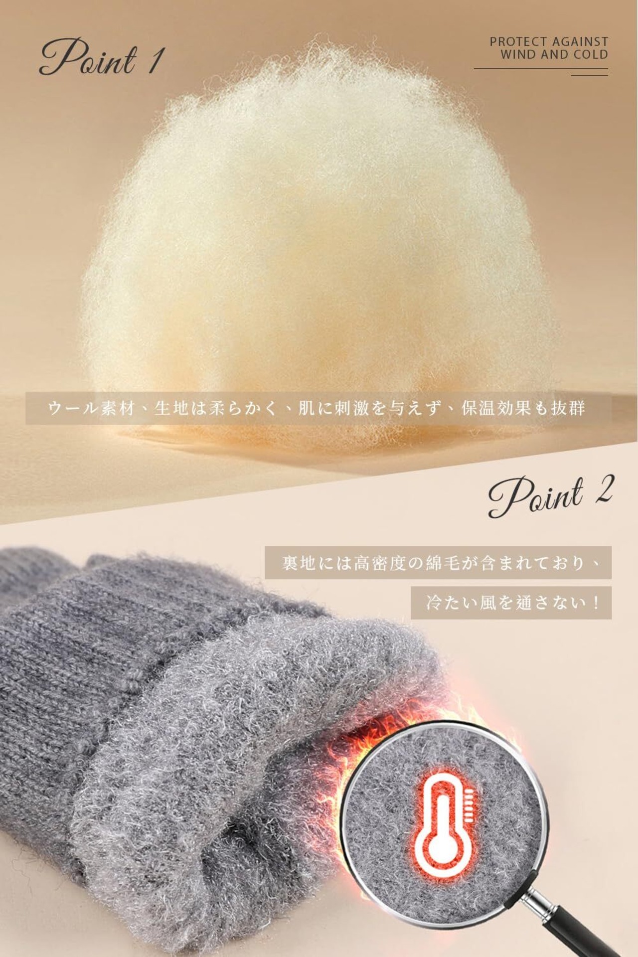 【フィット性伸縮性抜群】柔軟性や伸縮性に優れたニット編みで、指の曲げ伸ばしに追従し、手の動きもスムーズに快適に着用することができます。手の曲線にフィットし、締め付けなく、指先まで包み込まれます。手首はリブ編みで程よく引き締める為、綺麗なシルエットを実現しながら、風の侵入を防ぎ、寒い冬でも手がポカポカです。