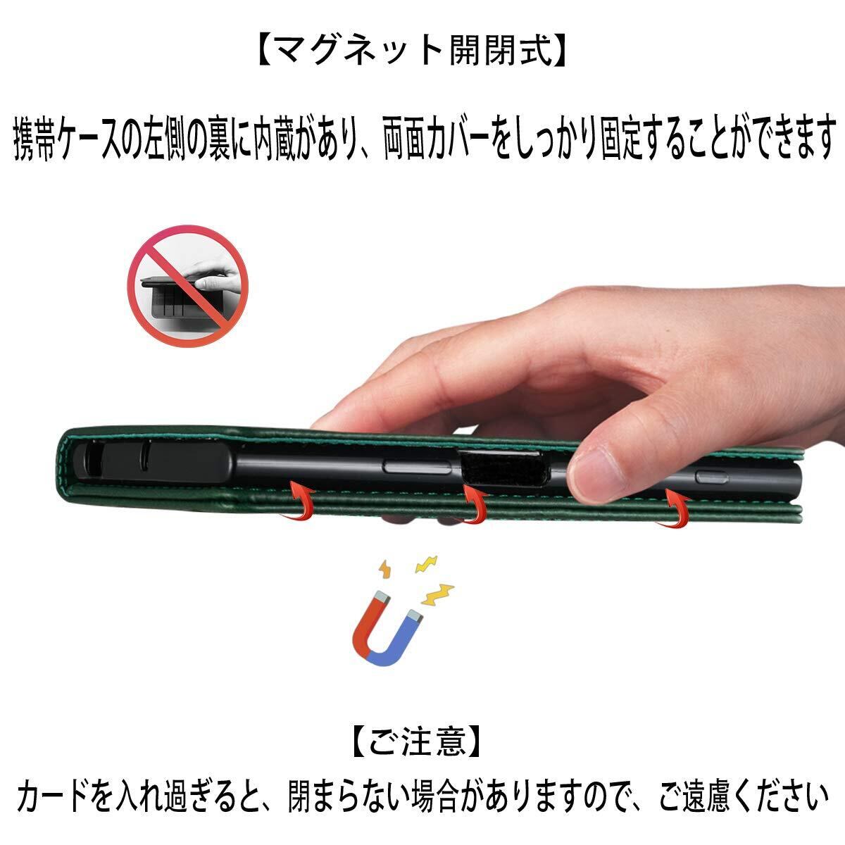 【カードポケット付き】:財布型ケースとして、名刺やお札などを入れるカードポケットがつき、ちょっとしたお出かけにもスマホケース一つでOK!日常生活に便利です。ただし、カードを入れ過ぎると、閉まらない場合がありますので、ご遠慮ください。