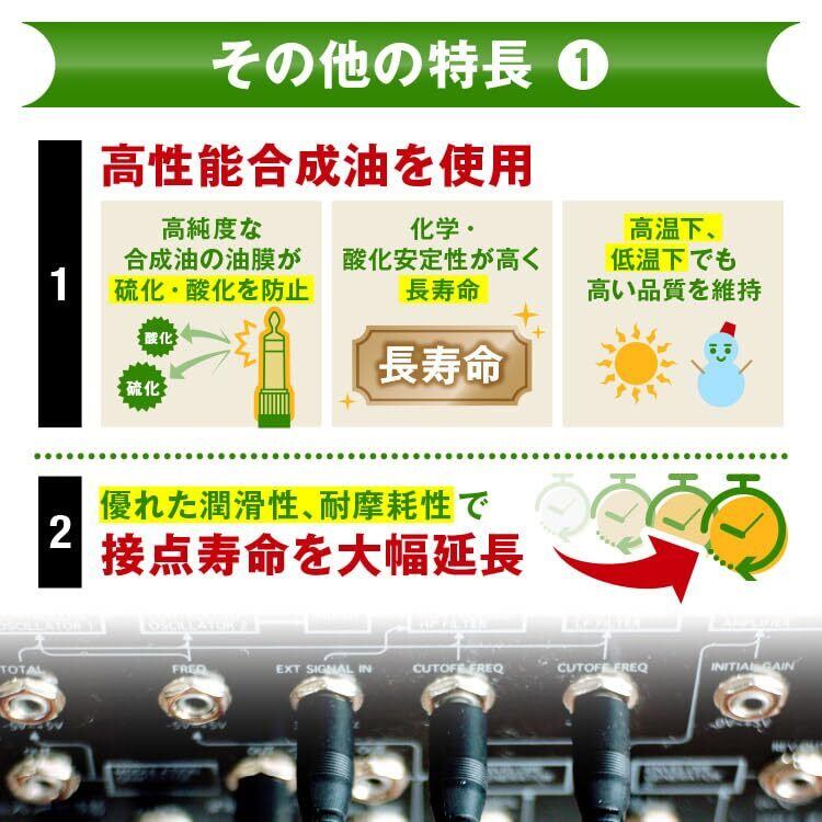 オーディオ機器やアンプ、エレキギターなど、電気楽器の各種スイッチ、ボリューム、プラグジャックの汚れを除去し、接点不良やガリノイズを解消します。