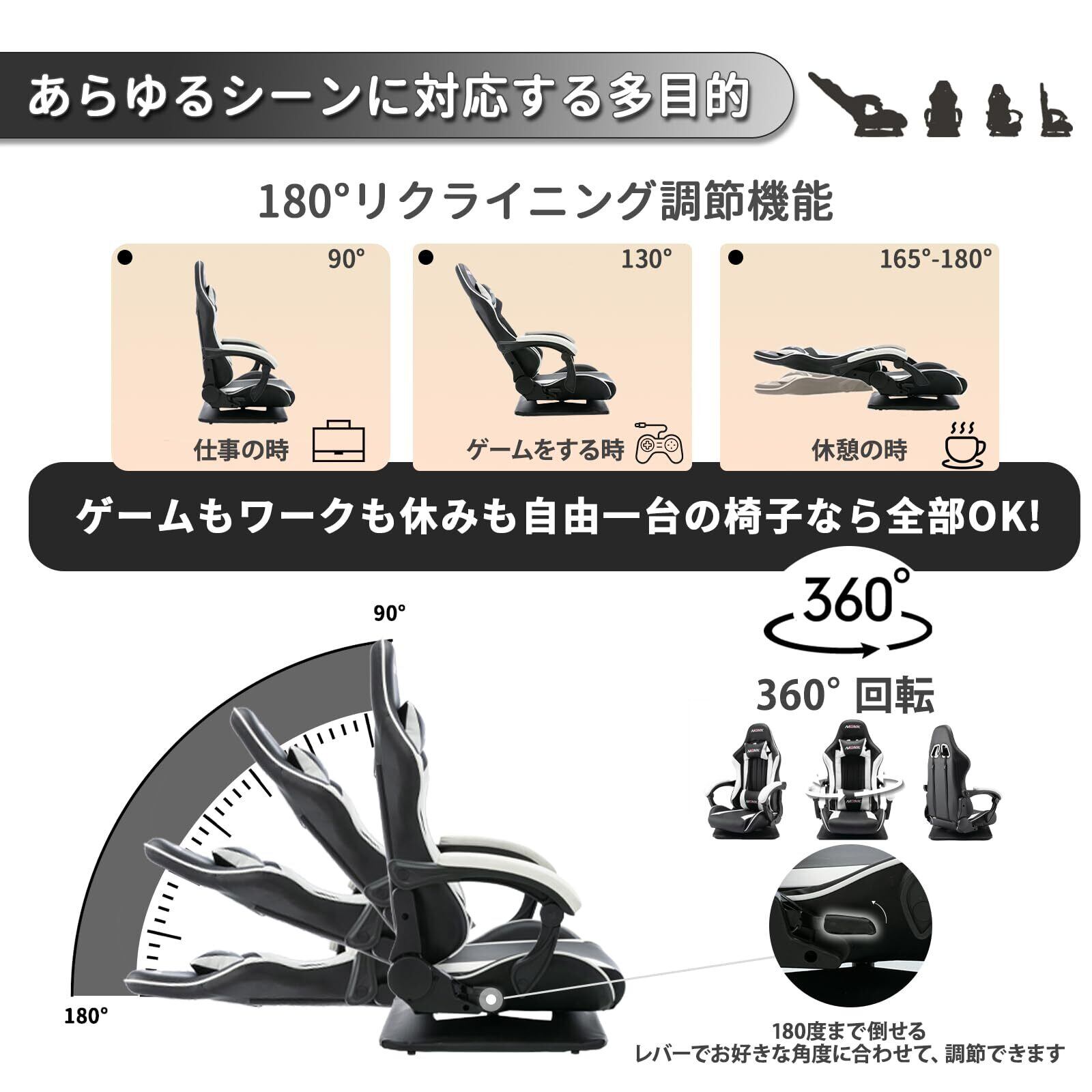 【フル機能のゲーミングチェア】最大180度まで調整可能、特別なスクラッチ/滑り止めパッドが付いた360度回転機能で、お好みの方向にチェアを回転させることができます。360度回転機能により、スムーズに立ち上がって物を取ることができます。