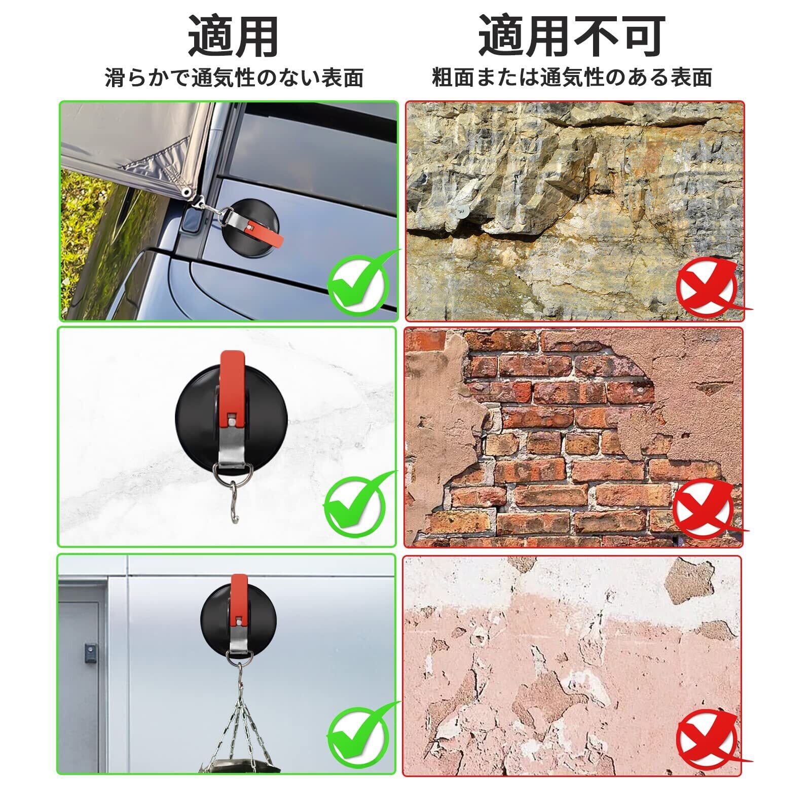【多用途】吸着フックは殆どの物を固定することができる優れた方法です。いつ落ちるかの不安に悩まされることはもうありません。カーサイドタープやサンシェードの固定として使用できるだけでなく、屋内外での使用やカーキャンプや旅行などでの仮設アイテムフックとして使用できます。アウトドアに最適ですが、家でもバスルームやキッチンのフックとしても使用することができます。