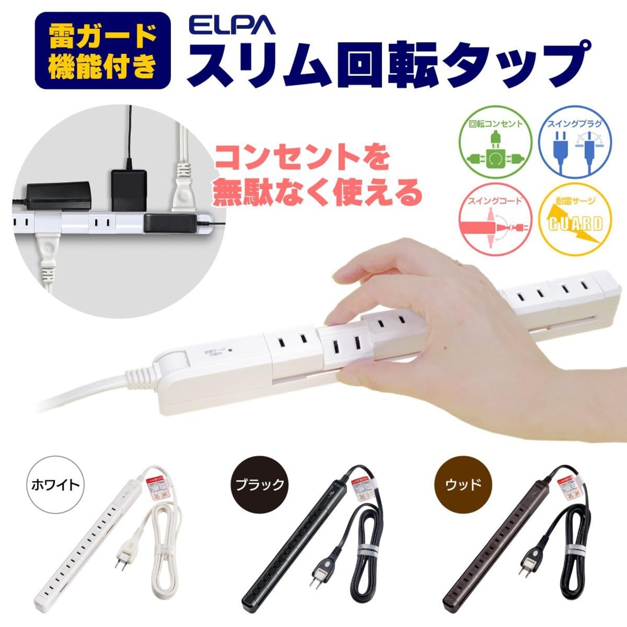 【7個口スリム回転タップ】差込口が回転するから、大きなACアダプタでも無駄なく差せる、エルパの雷ガード機能付き『スリム回転タップ』は、スリムなデザインと左右に回転するコンセントが特徴です。