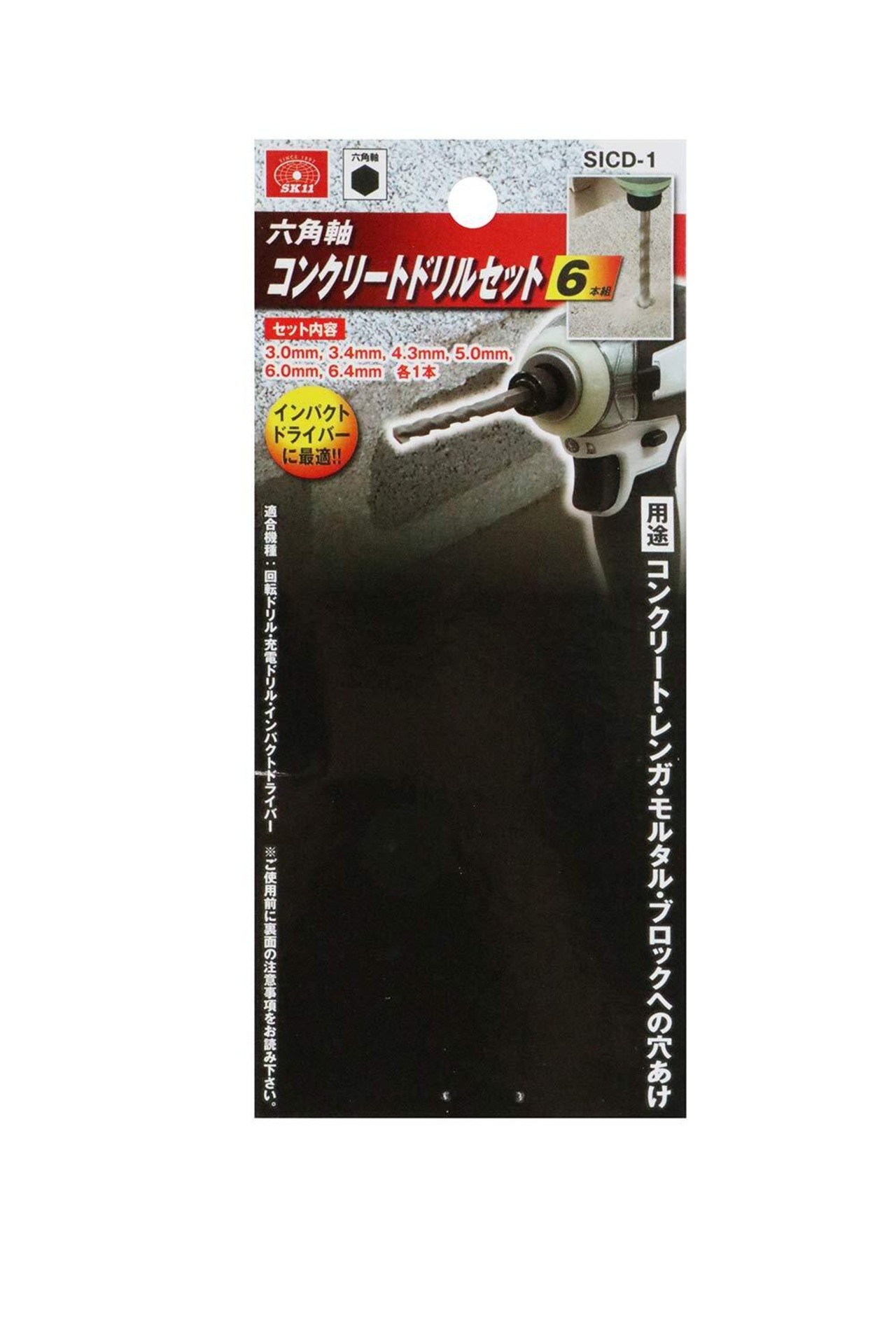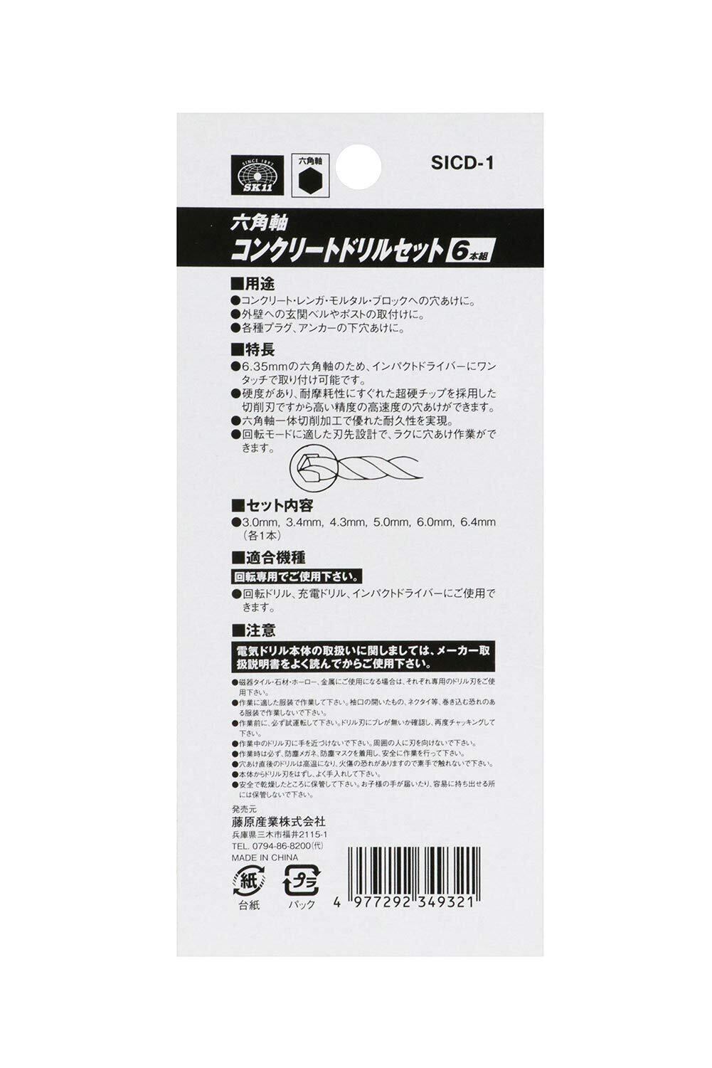 【在庫処分】SK11(エスケー11) 六角軸 コンクリートドリルセット 6本組 3.0・3.4・4.3・5.0・6.0・6.4mm SICD-1