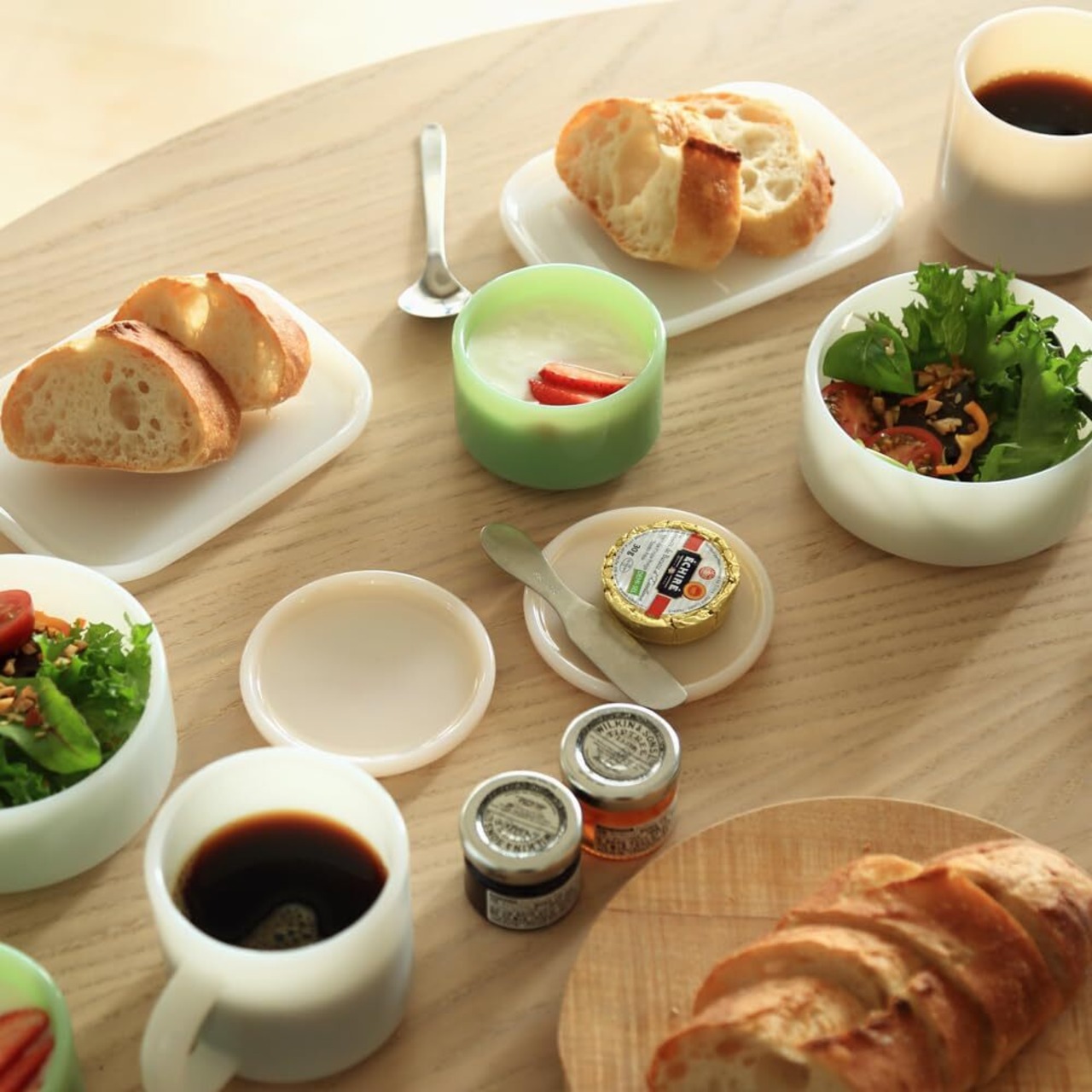 ヴィンテージなミルクガラスのスタックテーブルウェア