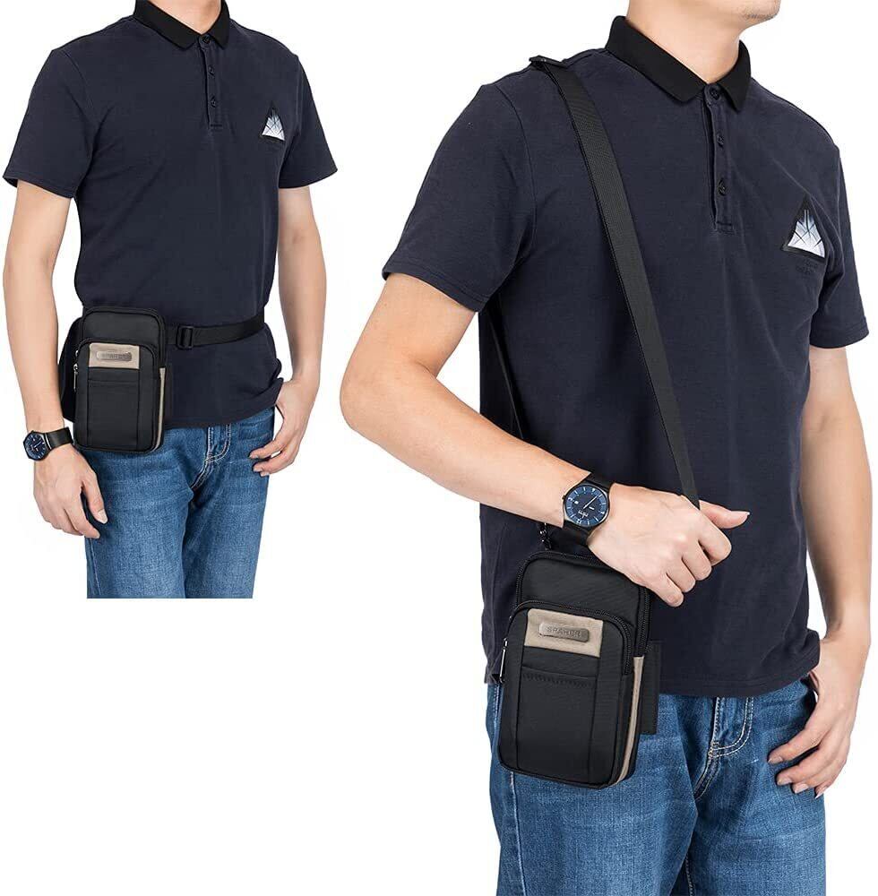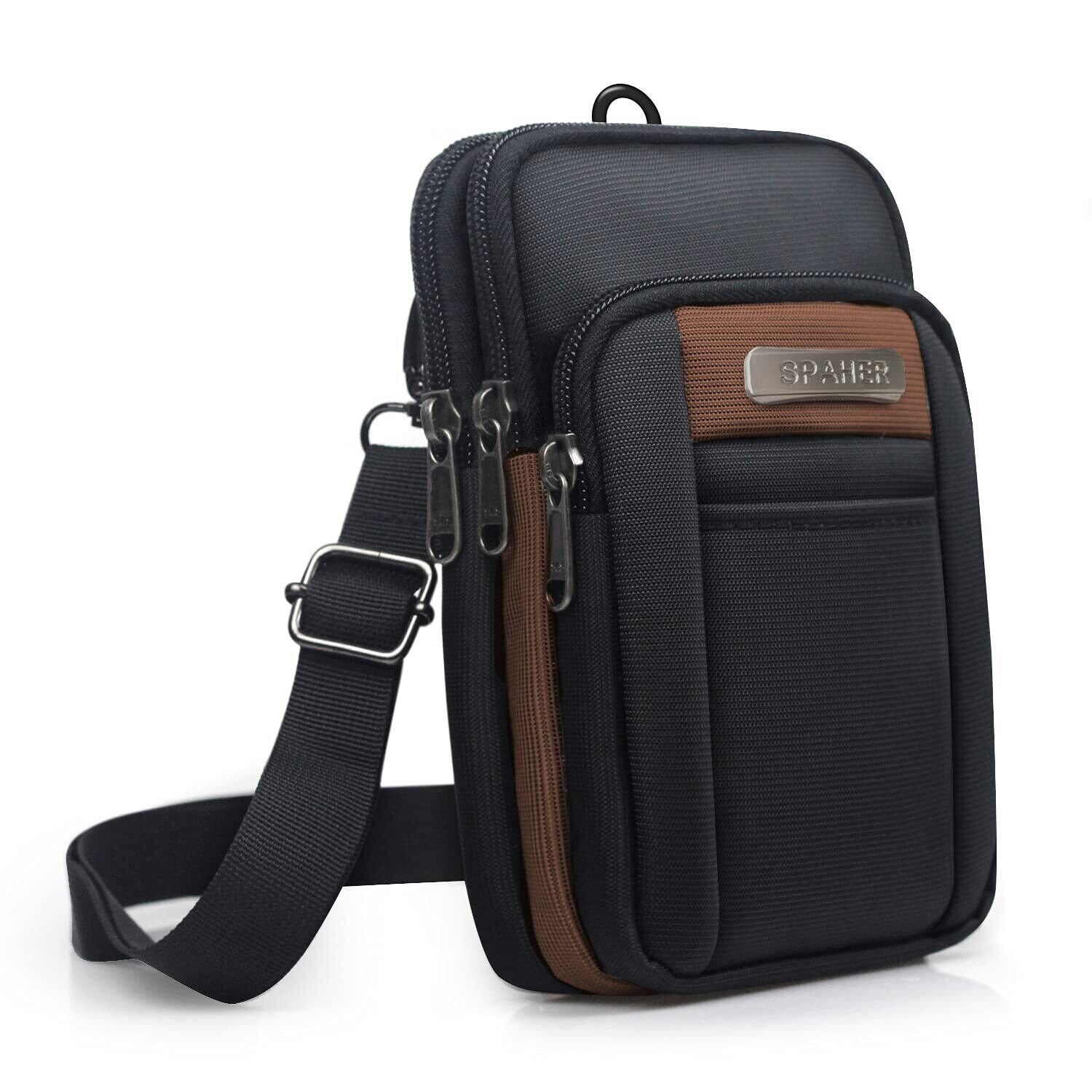 【在庫セール】SPAHER スマホポーチ メンズ 小物入れ ウエストポーチ 防水 ベルトポーチ 小さめ マルチポーチ 旅行 アウトドア 登山 多機能収納 携帯 ガジェット ショルダーストラップ付き カラビナ付き 4層 ブラウン