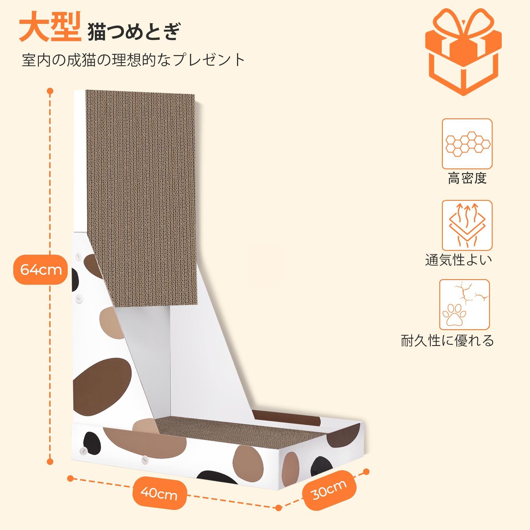 「大型猫爪研ぎ」L字型40*30*60cm(縦*横*高さ)。40CM幅の猫爪研ぎは、成猫が自然な爪とぎ行動を存分に楽しむことができ、全身を伸ばすことができます。大きな台座はより安定した基盤が得られ、激しい使用時に壁掛け式猫爪とぎが倒れるのを防ぎます。