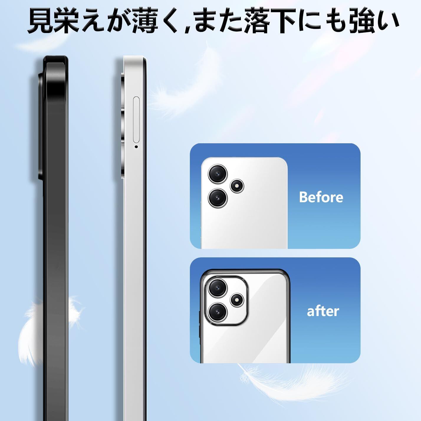 【オシャレ・シンプル】クリアな背面高い透明感を持ち、ケース四隅とボタン部分メッキ加工を応用し、シンプルで高級感溢れて、トレンディなメッキデザインは精緻されたライフスタイルを示します。超軽量薄型、redmi 12 5g本体とピッタリ密着しており、長く持っても手が疲れる感じもありません。