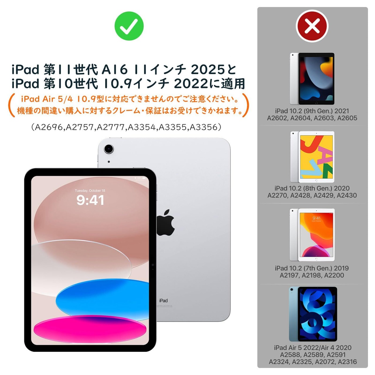 「対応機種」 New iPad (A16) 11インチ 第11世代(モデル番号:A3354/A3355/A3356)及び iPad 第10世代 2022 10.9インチ(モデル番号:A2696/A2757/A2777)向けに専用設計された半透明バックケースです。iPad Air 11 第7世代(M3)(×)、iPad Air 11 第6世代(M2)(×)、iPad Air 10.9インチ 第5/4世代(×)、又は他の機種に適用出来ませんので、ご購入の前にお手元のタブレット機種をご確認ください。