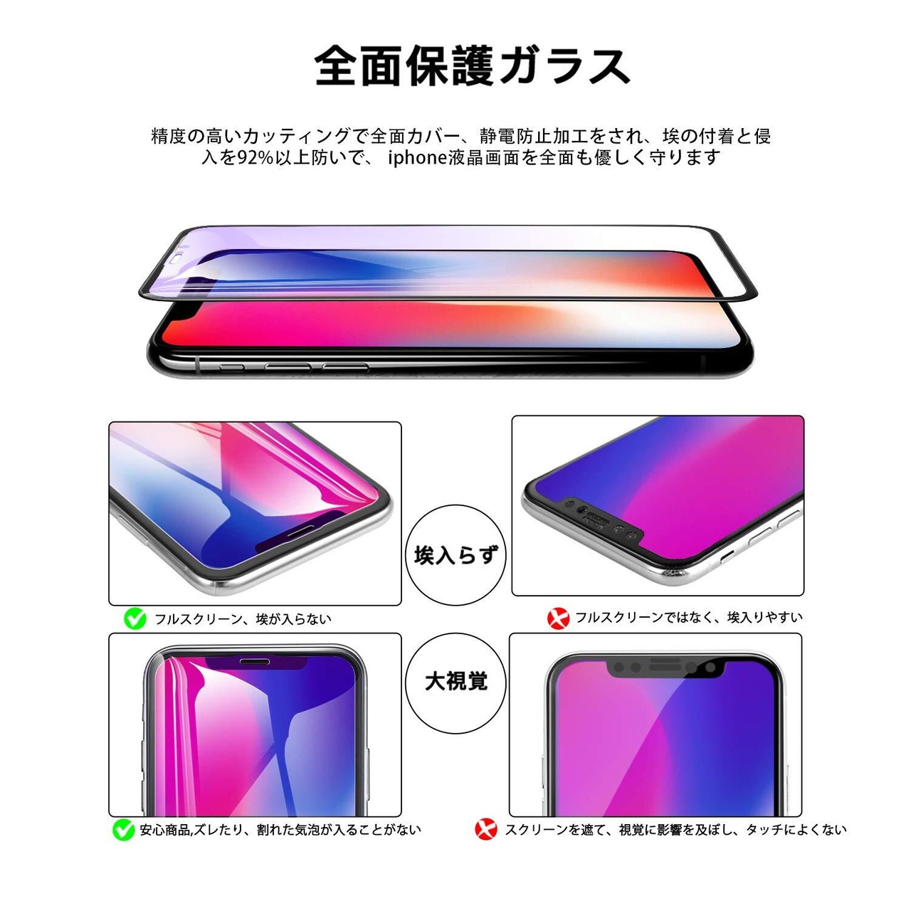 【全面保護、業界最高硬度9H、飛散防止】日本製旭硝子素材の採用、また硬度は業.界最高レベルの9Hであり。アイフォンxs Max強化ガラスフィルム+炭素繊維フレーム』フレーム部分は「軽、強」最先端技術の3Dラウンドエッジ加工により、曲面の完全カバーを実現。割れにくいだけではなく、丈夫で変形しにくいです、画面全体を保護する,防爆裂、飛散防止加工で、万が一ガラスが割れてしまった場合でもガラスが飛び散らず張り付いた状態になります。