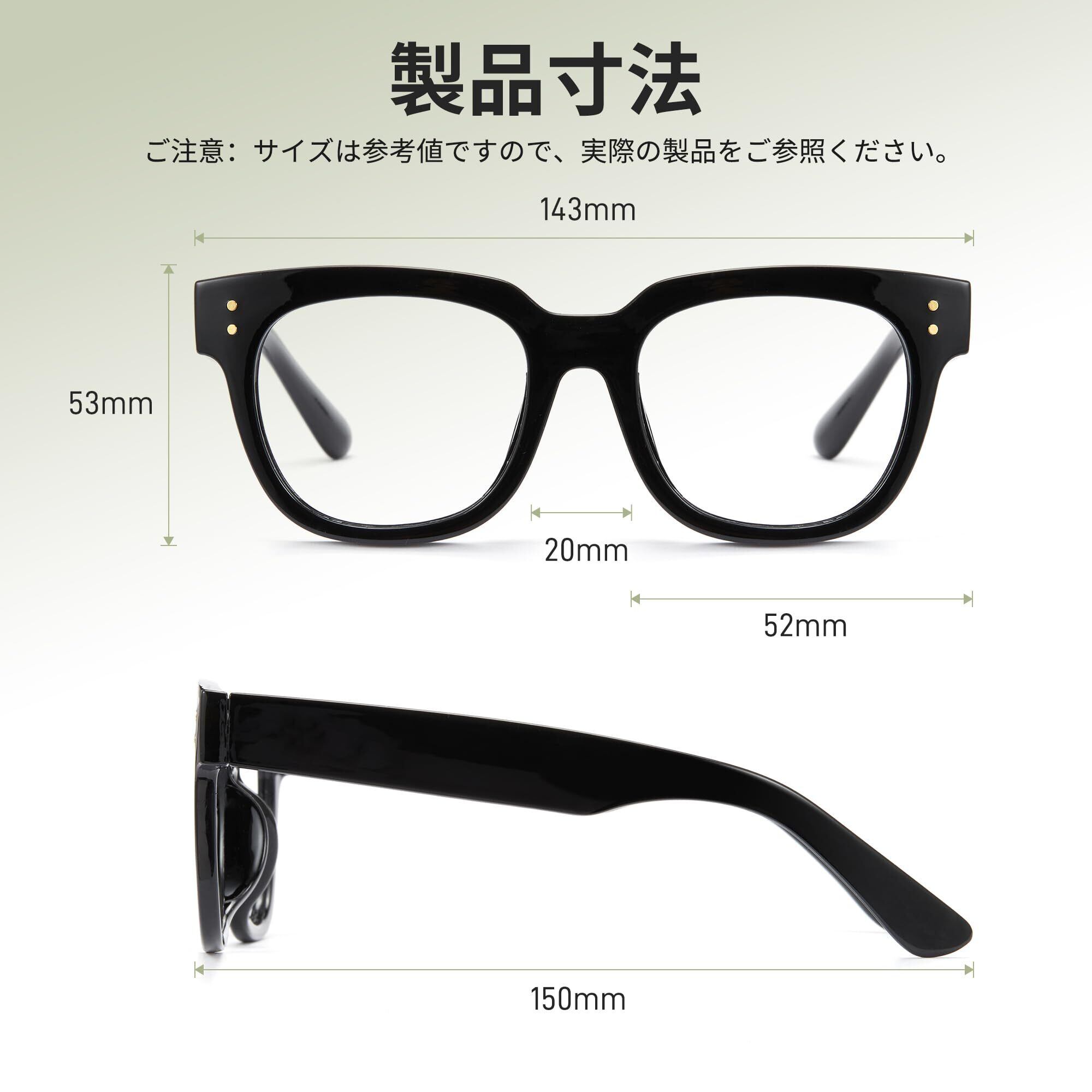商品仕様:サイズについて:レンズ横幅:52mm、レンズ縦幅:53mm、ブリッジ:20mm、テンプル:150mm、フレーム幅:143mm