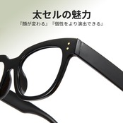 太セルフレーム:太セルの魅力といえば『顔が変わる』『個性をより演出できる』という点です。太セルフレームはボリュームがあり、その存在感が目元に力強さを与えてくれます。手軽にいつもの自分との変化が楽しめる点で魅力があります