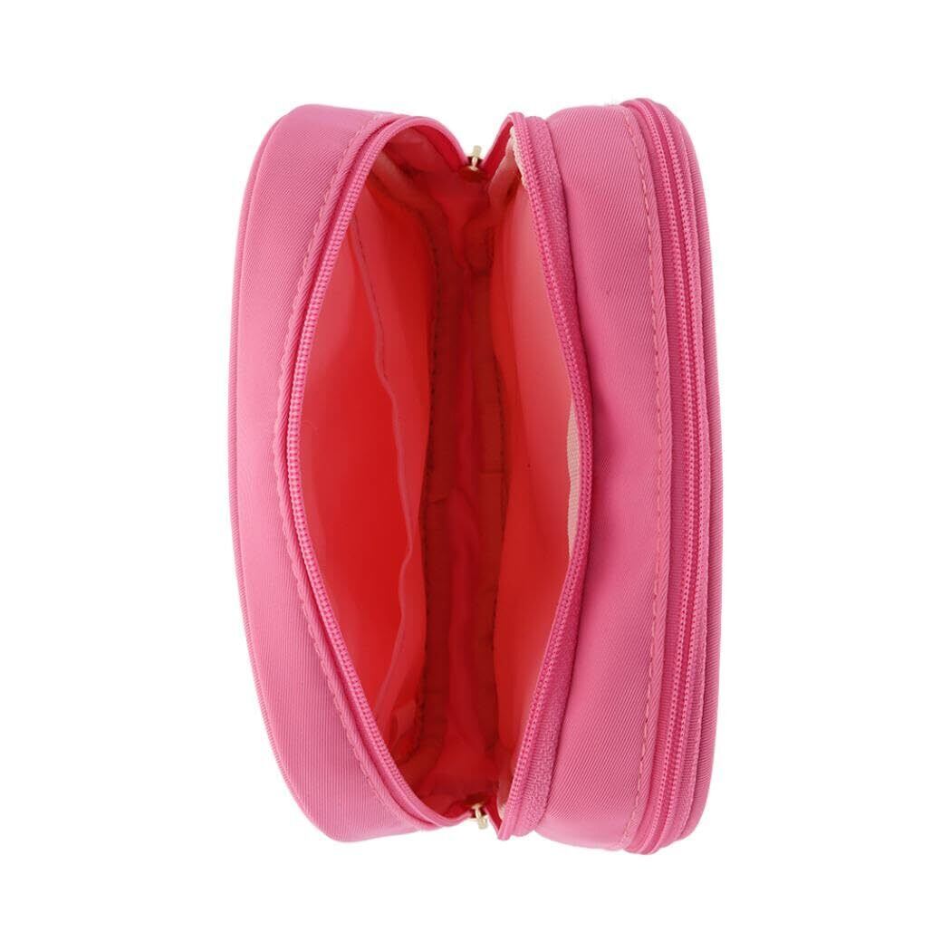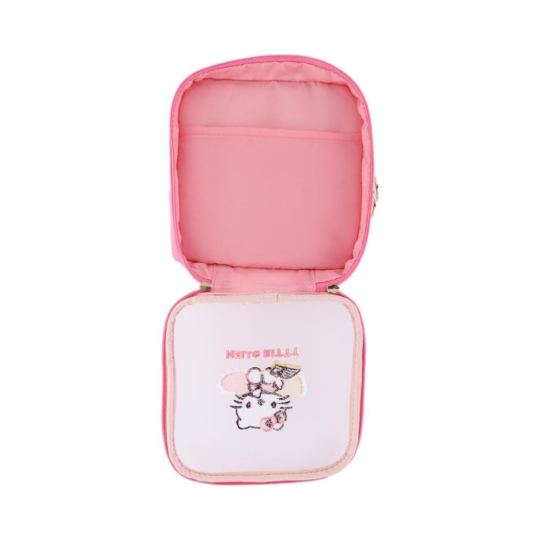 ダブルファスナーで出し入れしやすい!ポケット部分のイラストは刺繍で表現しています。ピンクが基調の[ハローキティ]柄です。