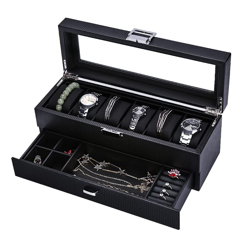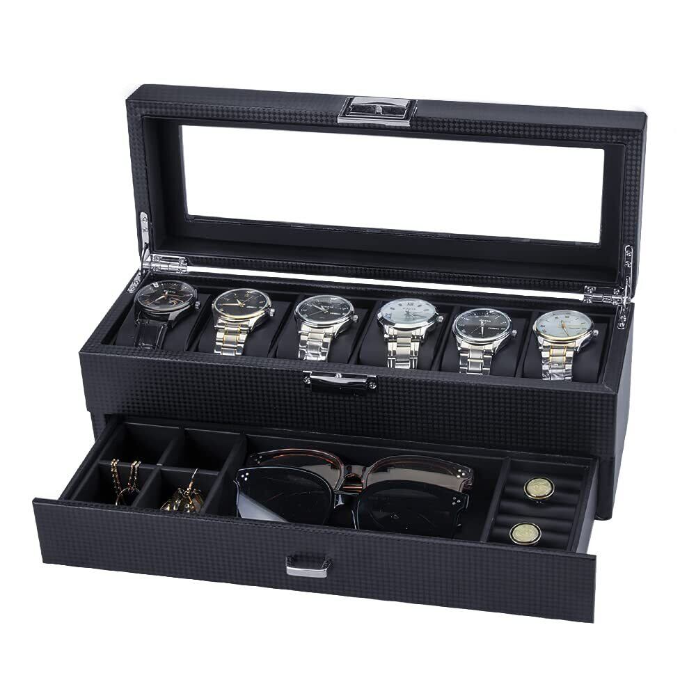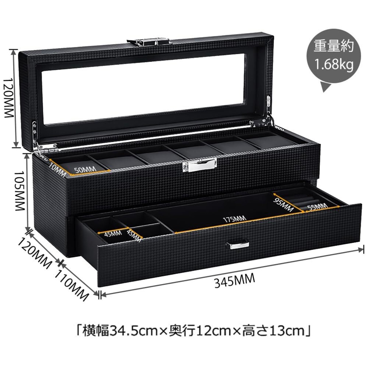 【ウォッチケース素材&サイズ】外側:カーボン、クッション:PUレザー製、トッププレート:クリアガラス、サイズ:34.5cm(L)*12cm(W)*10.5cm(H) 収納力:上段6個、下段ジュエリー、指輪、サングラスなどの小物も収納できます。